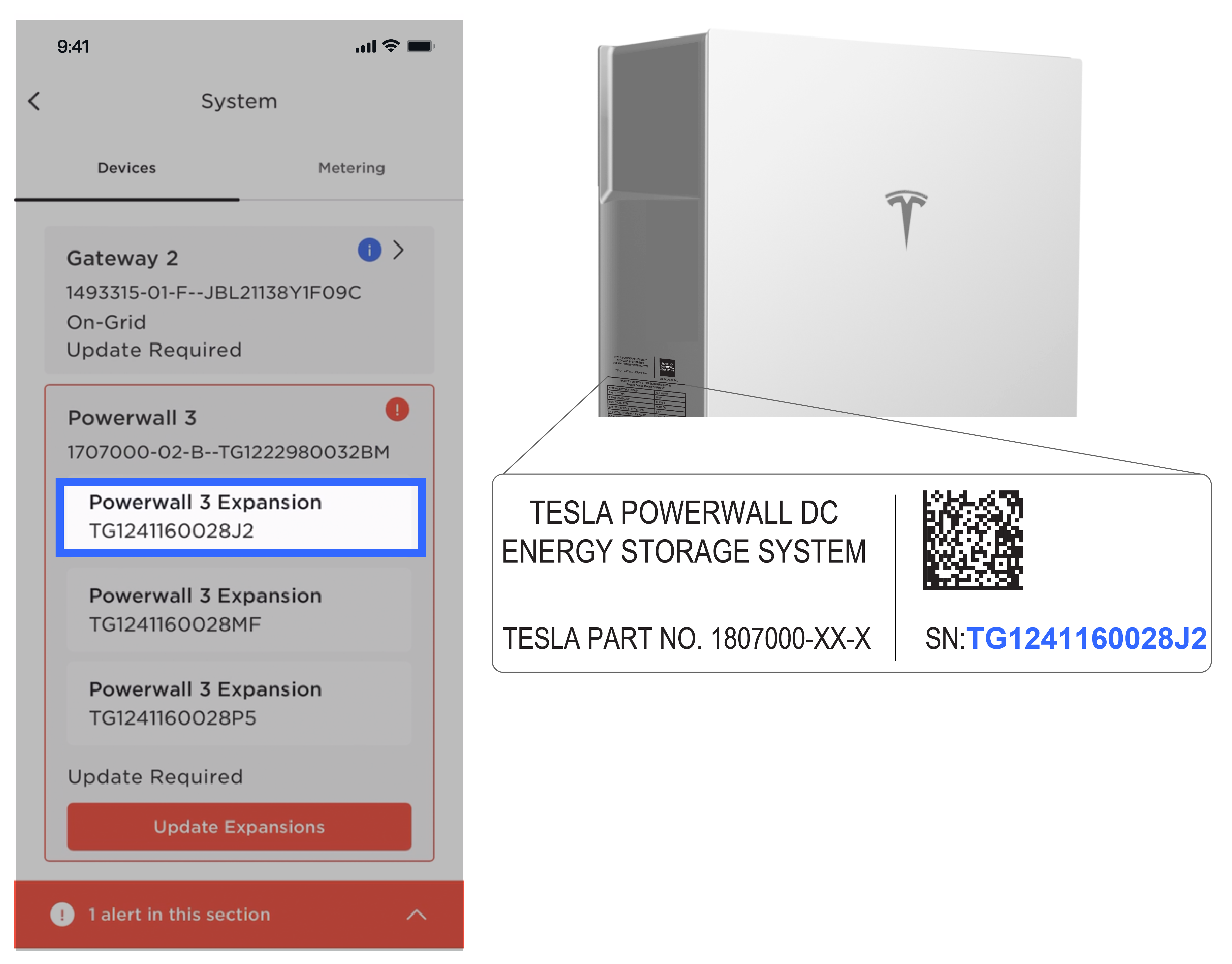 - Prüfen Sie, dass die Expansion (Erweiterung)- Seriennummern in Tesla One mit denen der installierten Geräte übereinstimmen. Diese befinden sich auf der linken Geräteseite.