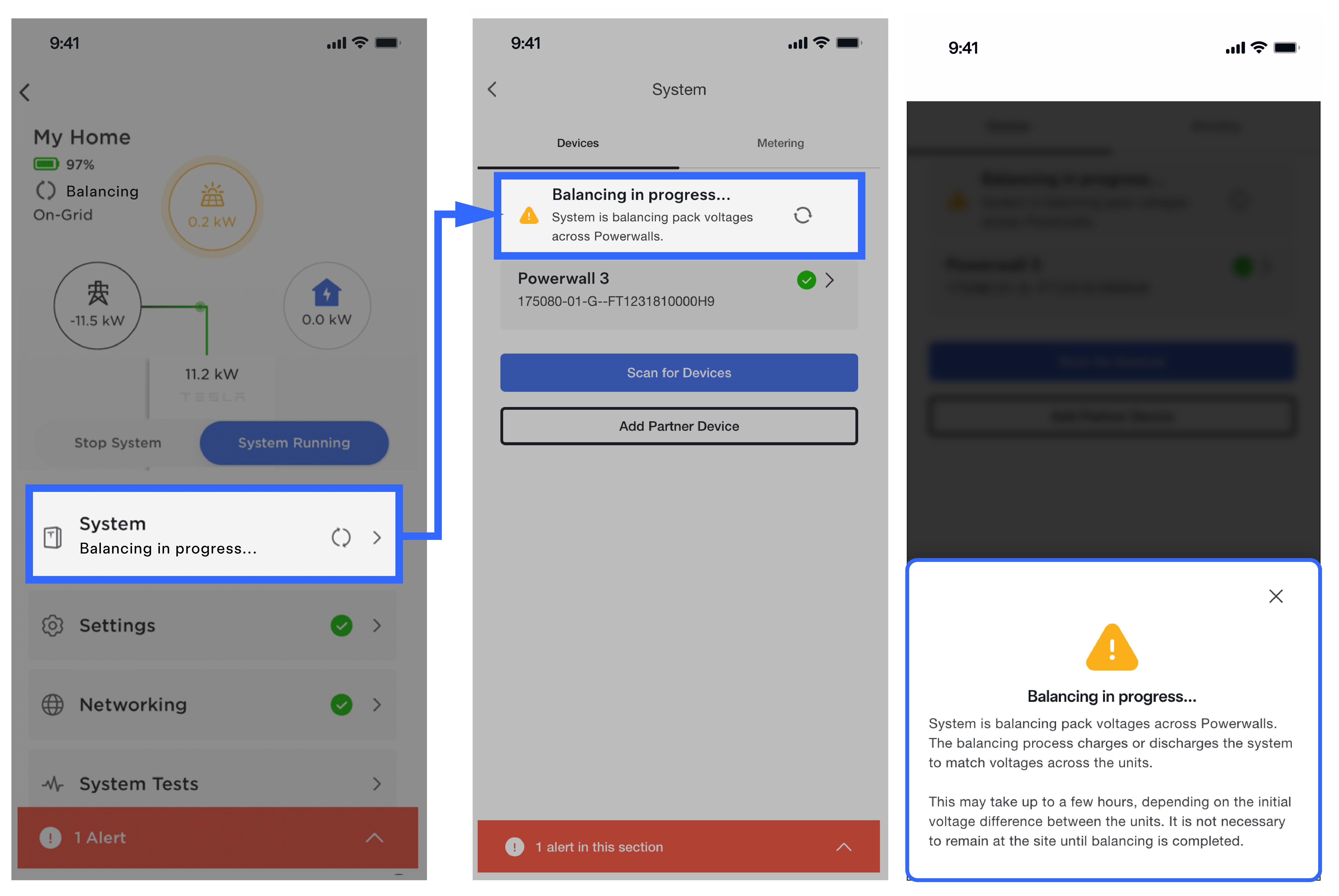 - Wenn das System Expansion (Erweiterung) Einheiten enthält, beginnt der Ausgleich automatisch, wobei das System jeweils (1) Expansion (Erweiterung)-Einheit ausgleicht. Innerhalb von etwa einer Minute zeigt Tesla OneAusgleich wird durchgeführt... an.AnmerkungExpansion (Erweiterung) -Geräte haben ein internes Relais, das anfangs geöffnet ist. Um das Relais zu schließen, muss die Spannung an jedem Expansion (Erweiterung)-Gerät mit der der anderen Geräte übereinstimmen. Beim Ausgleichsprozess wird die Powerwall 3 geladen oder entladen, um die Spannungen zwischen den Geräten anzugleichen.AnmerkungWährend des Ausgleichsprozesses ist kein Eingriff des Installateurs erforderlich. Da der Vorgang zwischen einigen Minuten und einigen Stunden in Anspruch nehmen kann, ist eine Anwesenheit vor Ort bis zum Abschluss des Ausgleichsprozesses nicht erforderlich.