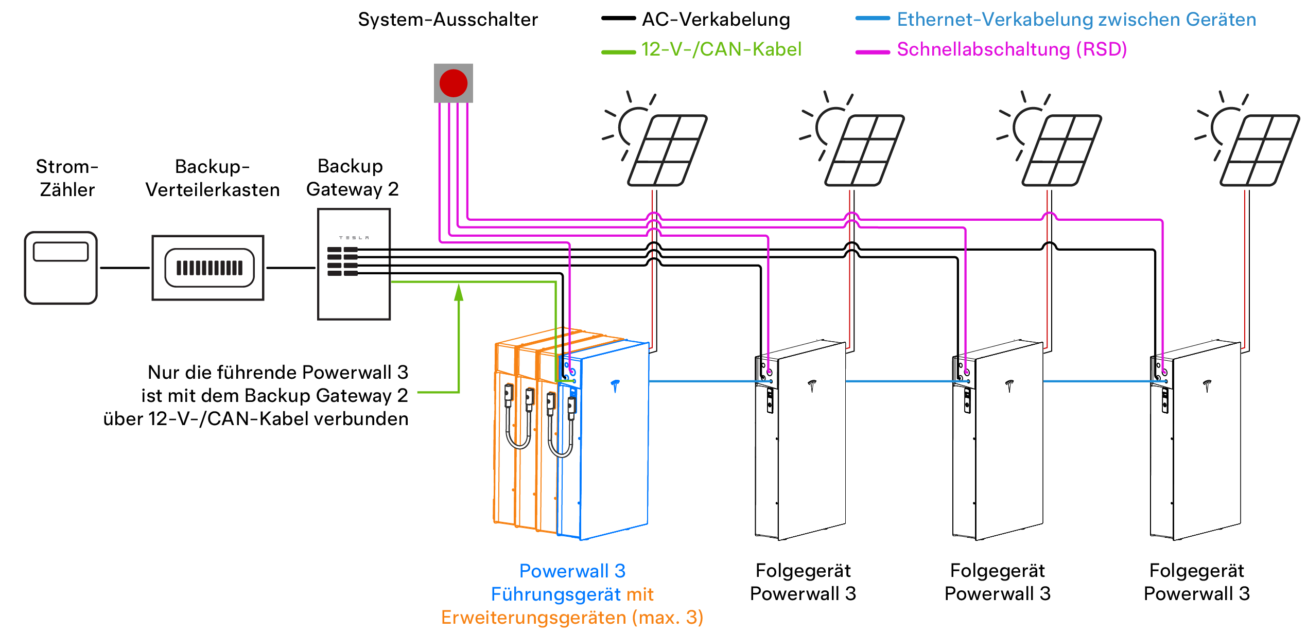 Die Powerwall 3, die über die 12-V-/CAN-Verkabelung mit dem Backup Gateway verbunden ist, wird als Führende Powerwall 3 bezeichnet. Bevor Sie eine Verbindung zu einer Powerwall 3 herstellen, notieren Sie sich, bei welcher Einheit es sich um das Führungsgerät handelt und welche Einheiten Folgegeräte sind.