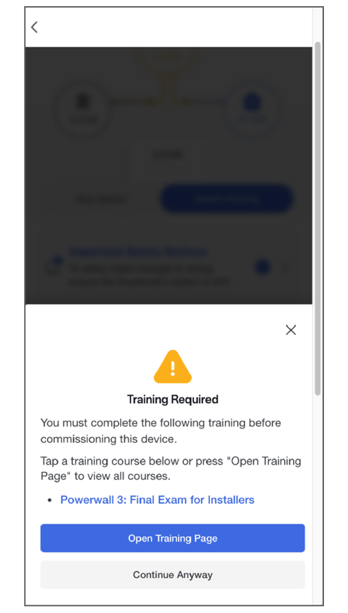 Partner Portal account credentials.NoteSee Install / Update Tesla One for instructions to install Tesla One if it has not already been installed on the commissioning device.NoteThe Training Required alert will automatically appear for any installer who has not yet completed the required Powerwall 3: Final Exam for Installers training.