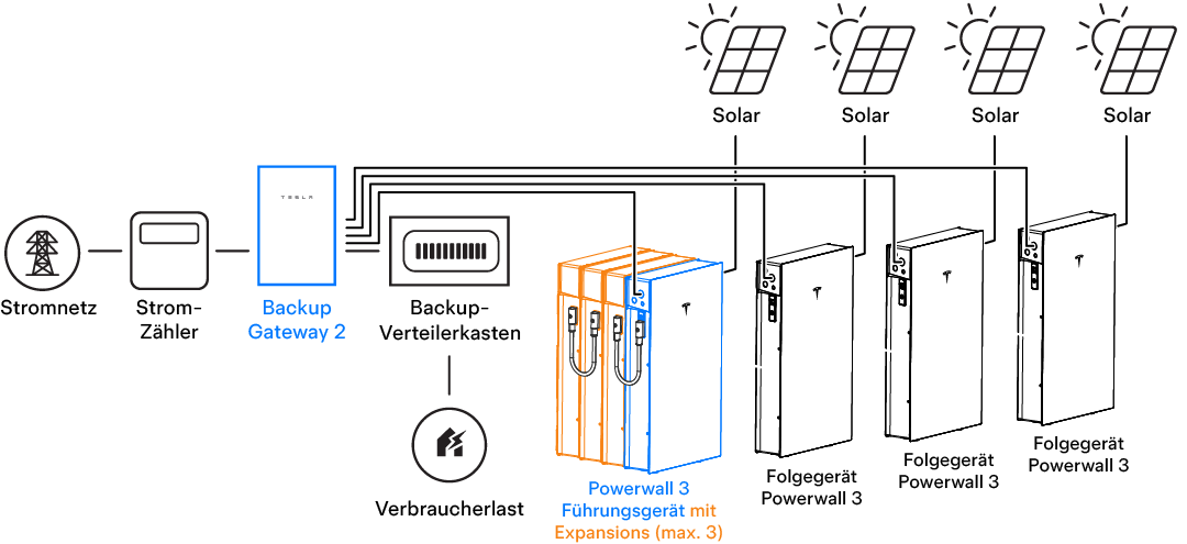 Powerwall 3 Expansion (Erweiterung) ist eine Batterie, die zusätzlichen Speicher für ein Powerwall 3 System bietet. Da der Expansion (Erweiterung) keinen Wechselrichter enthält, kann er nicht ohne Powerwall 3 installiert werden. Solar kann nicht mit einer Expansion (Erweiterung) Einheit verbunden werden. |