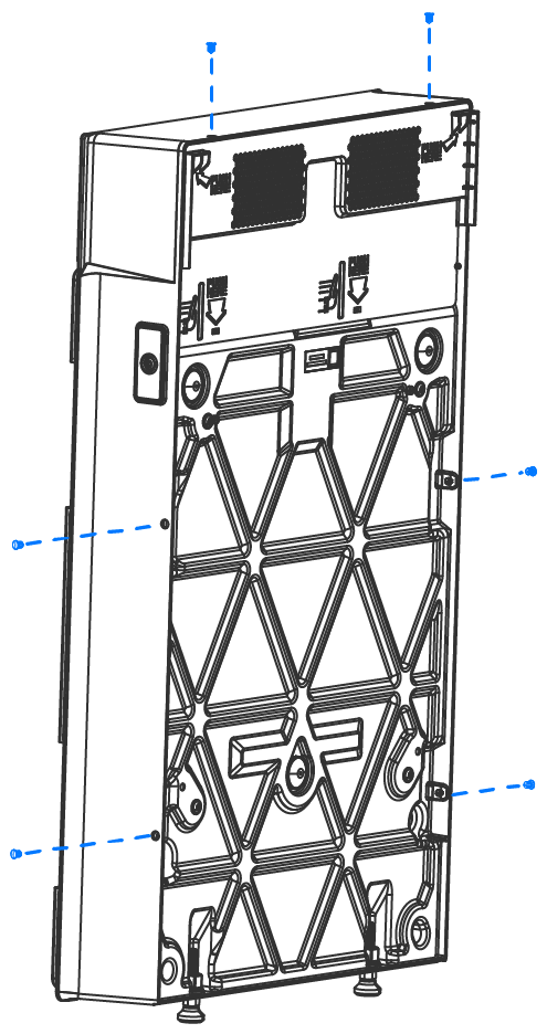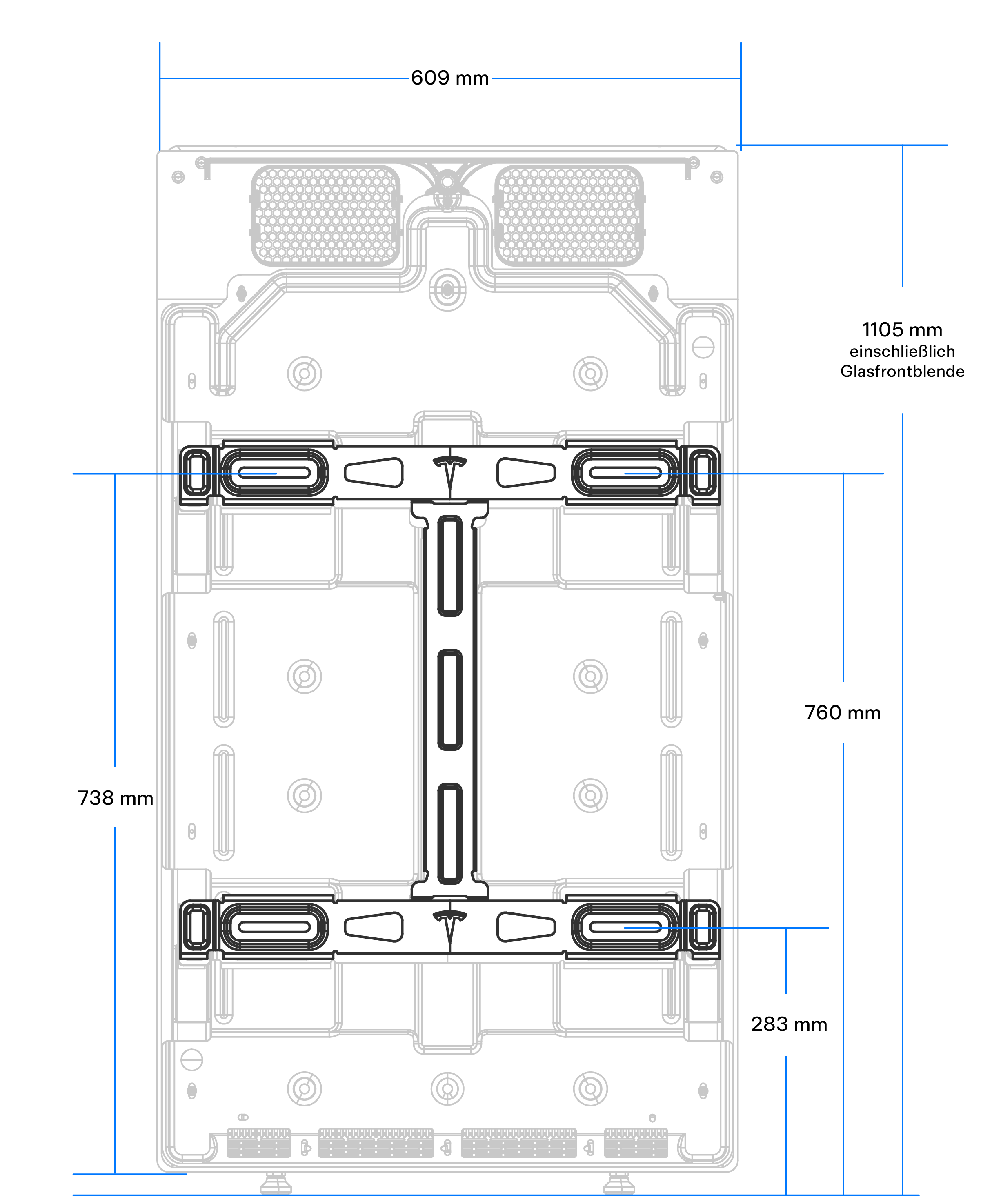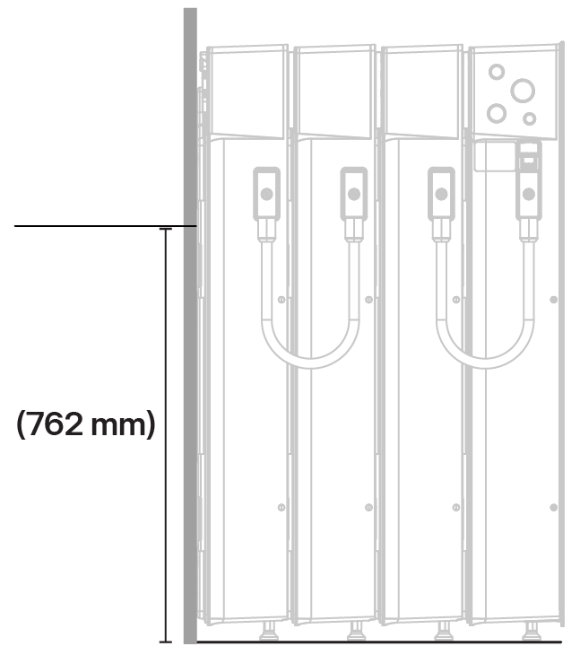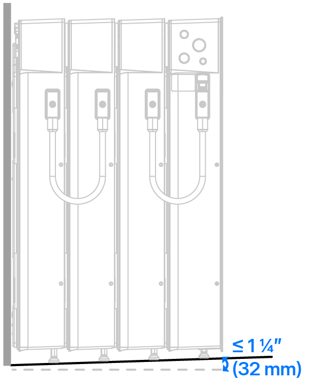 Abbildung 2. Halterungsmaße in Bezug auf Expansion (Erweiterung)-Gerät und Boden AnmerkungDiese Halterungsmaße sind für Expansion (Erweiterung) und Powerwall 3sgeräte gleich.WarnungBringen Sie die Schrauben nur in den (4) Schlitzen der horizontalen Halterungssegmente an. Bringen Sie keine Schrauben am vertikalen (mittleren) Segment an, da dies keine strukturellen Befestigungsbohrungen sind.AnmerkungDie im Expansion (Erweiterung)s-Stapelsatz enthaltenen Beilegscheiben für die Montagehalterung werden nicht für direkt an der Wand montierte Geräte verwendet. Die Beilegscheiben werden nur benötigt, um die Halterung zu befestigen, wenn sie an der Vorderseite eines Expansion (Erweiterung)sgeräts montiert wird. - Prüfen Sie, dass alle Stellfüße vollständig in das Expansion (Erweiterung)sgerät eingeschraubt sind. Dies ist erforderlich, damit nach der Montage der übrigen Geräte des Stapels eine Einstellung des Geräts möglich ist.