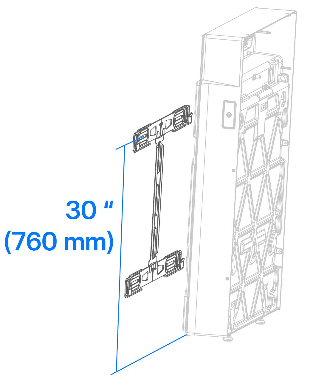 - Bei einer ebenen Oberfläche oder einer Oberfläche, die von der Wand weg geneigt ist, wird die Wandhalterung mit der oberen Reihe der Befestigungsschlitze 760 mm (30 Zoll) von der Unterkante der Wand entfernt montiert (siehe Halterungsmaße in Bezug auf Expansion (Erweiterung)-Gerät und Boden).