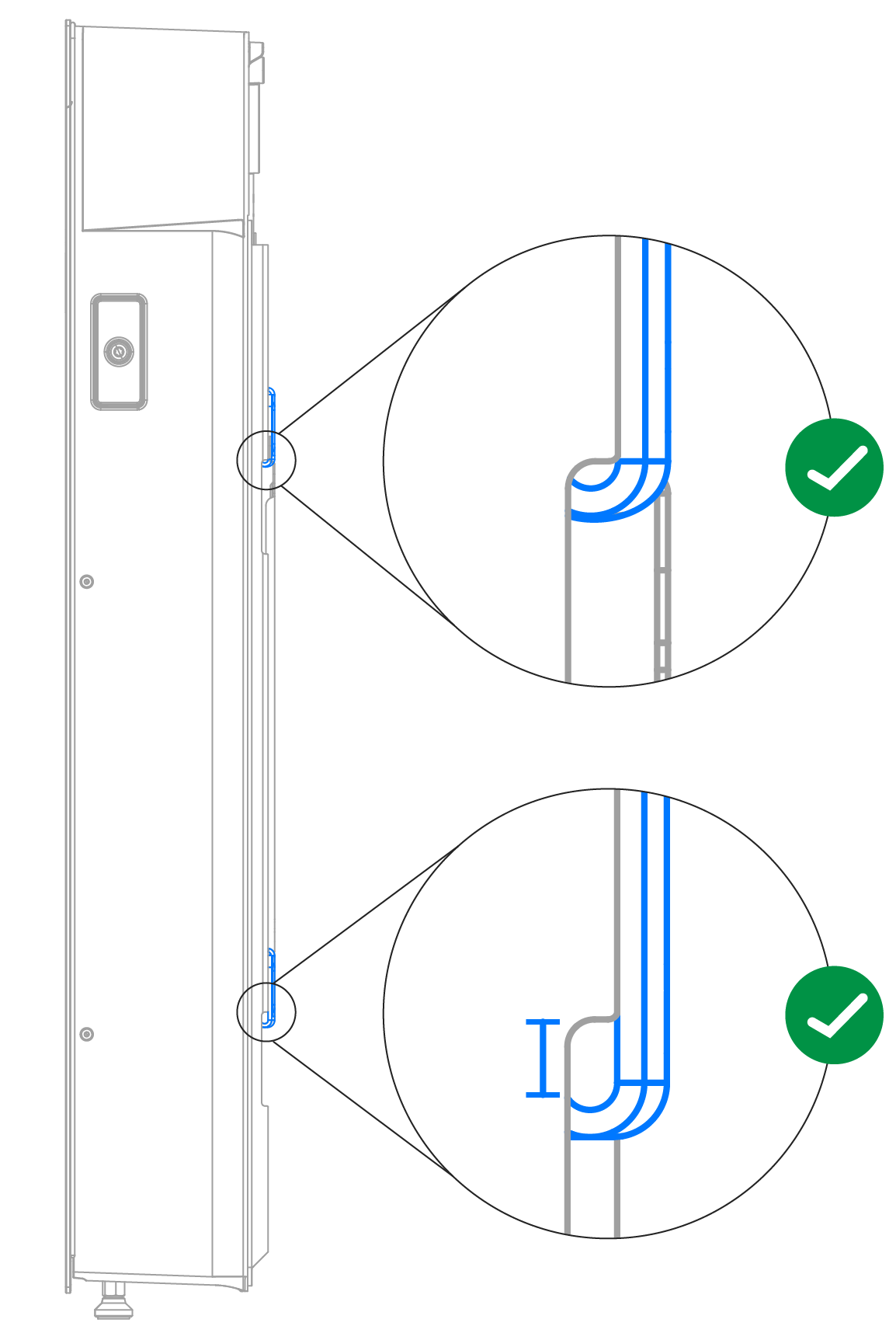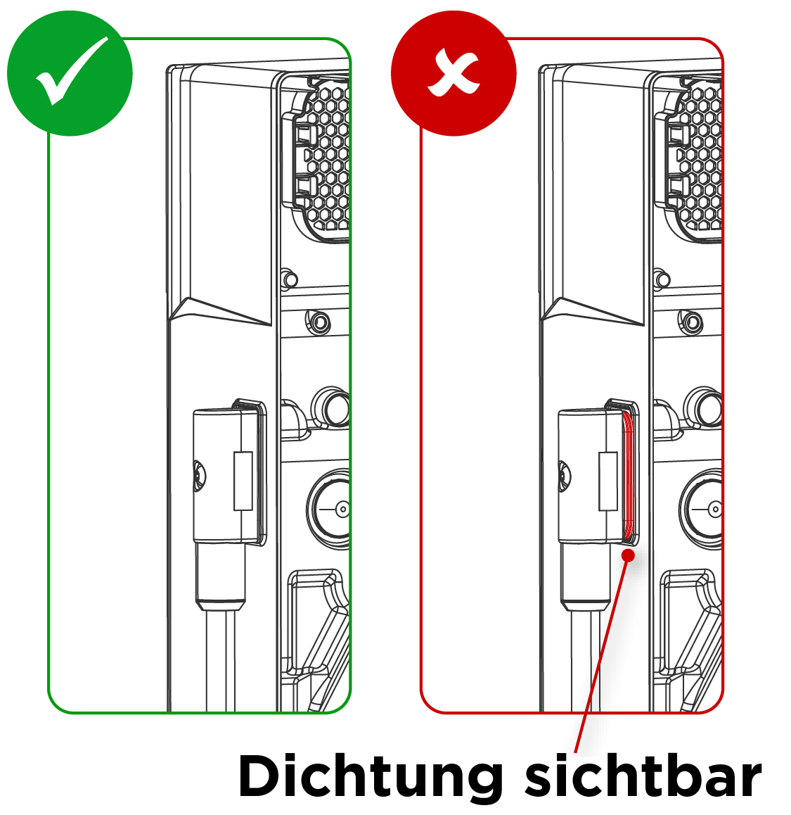 - Vergewissern Sie sich, dass beide Seiten des Erweiterungskabelbaums vollständig im Anschluss eingesteckt sind. Der korrekte Sitz des Kabelbaums ist daran erkennbar, dass keine Dichtung mehr freiliegt.