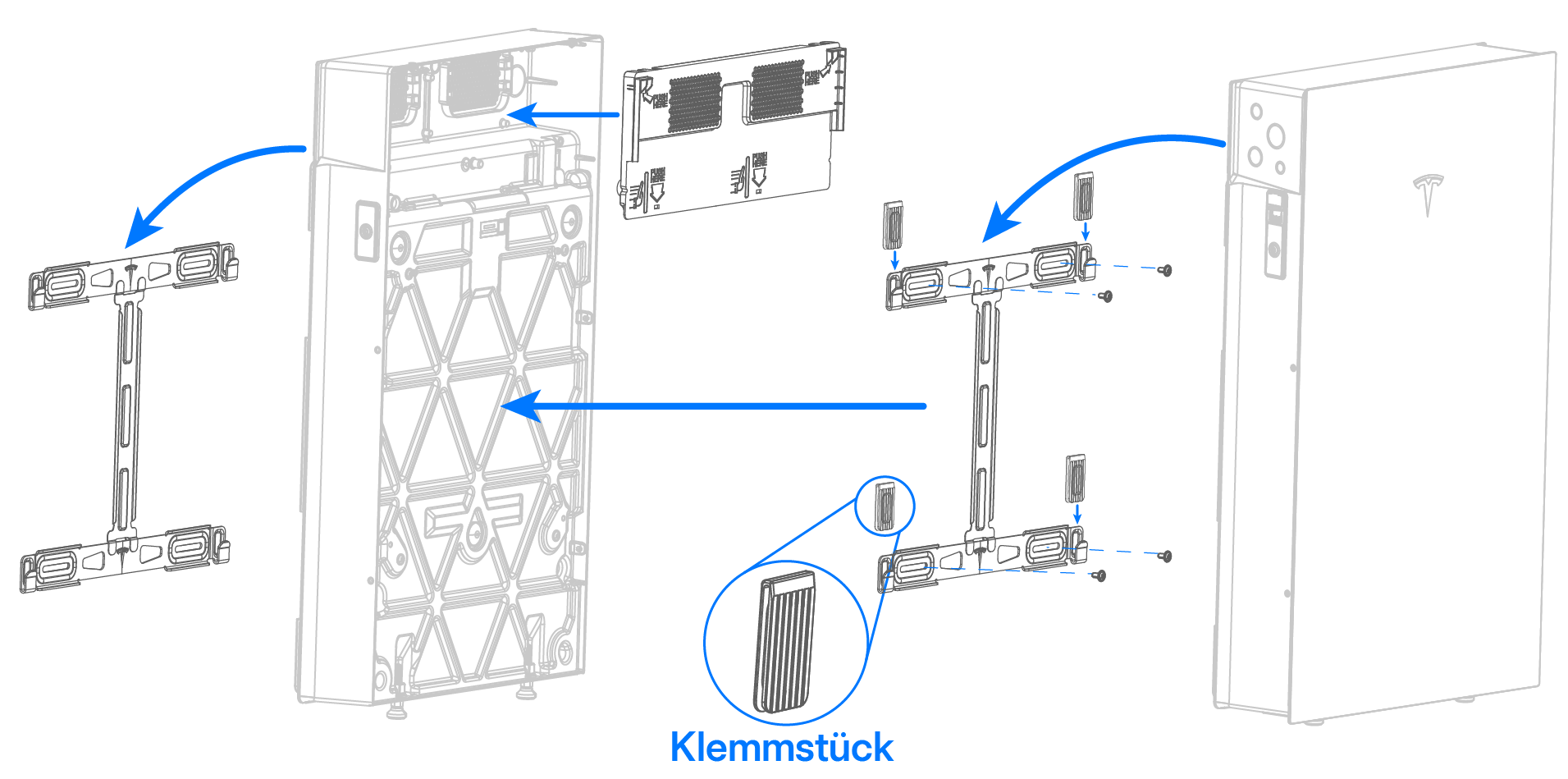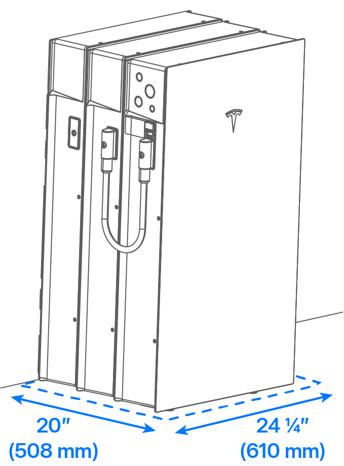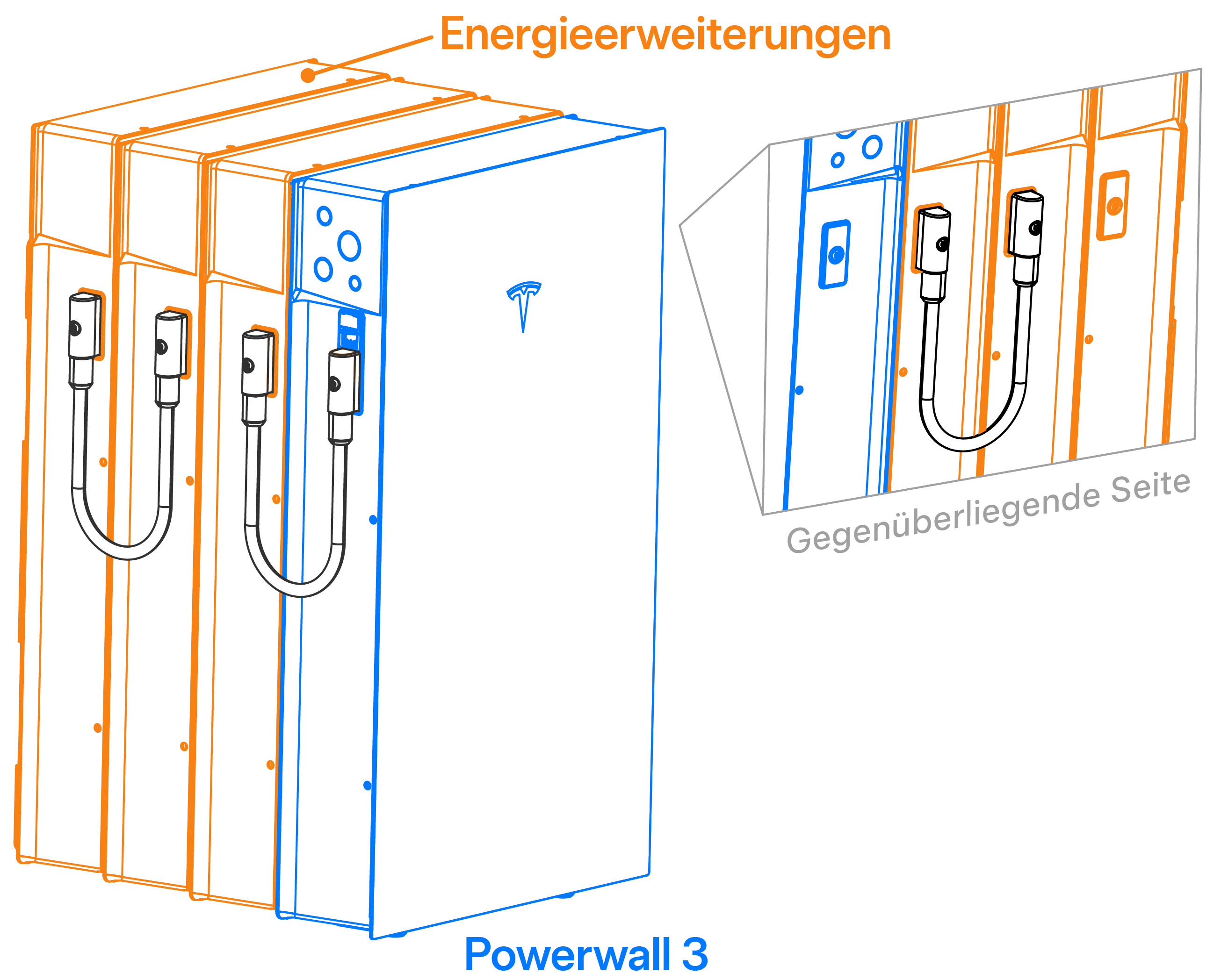 - Beginnen Sie mit SCHRITT 7: Herstellen der PV-Verbindungen der Solaranlage, um die Verkabelung der Powerwall 3 fertigzustellen, und bringen Sie zum Abschluss die Frontblende an.AnmerkungPowerwall 3 muss immer an der Vorderseite eines Expansion (Erweiterung)sgeräte-Stapels installiert werden. Wenn die Powerwall 3 bereits zuvor installiert war, muss sie abgebaut werden, damit sie wieder an der Vorderseite des neuen Stapels installiert werden kann.AnmerkungAlternativ kann eine weitere Expansion (Erweiterung) mit dem Wandmontagekit (Tesla-Teilenr. 1978069-xx-yy) an der Vorderseite des Stapels montiert werden.