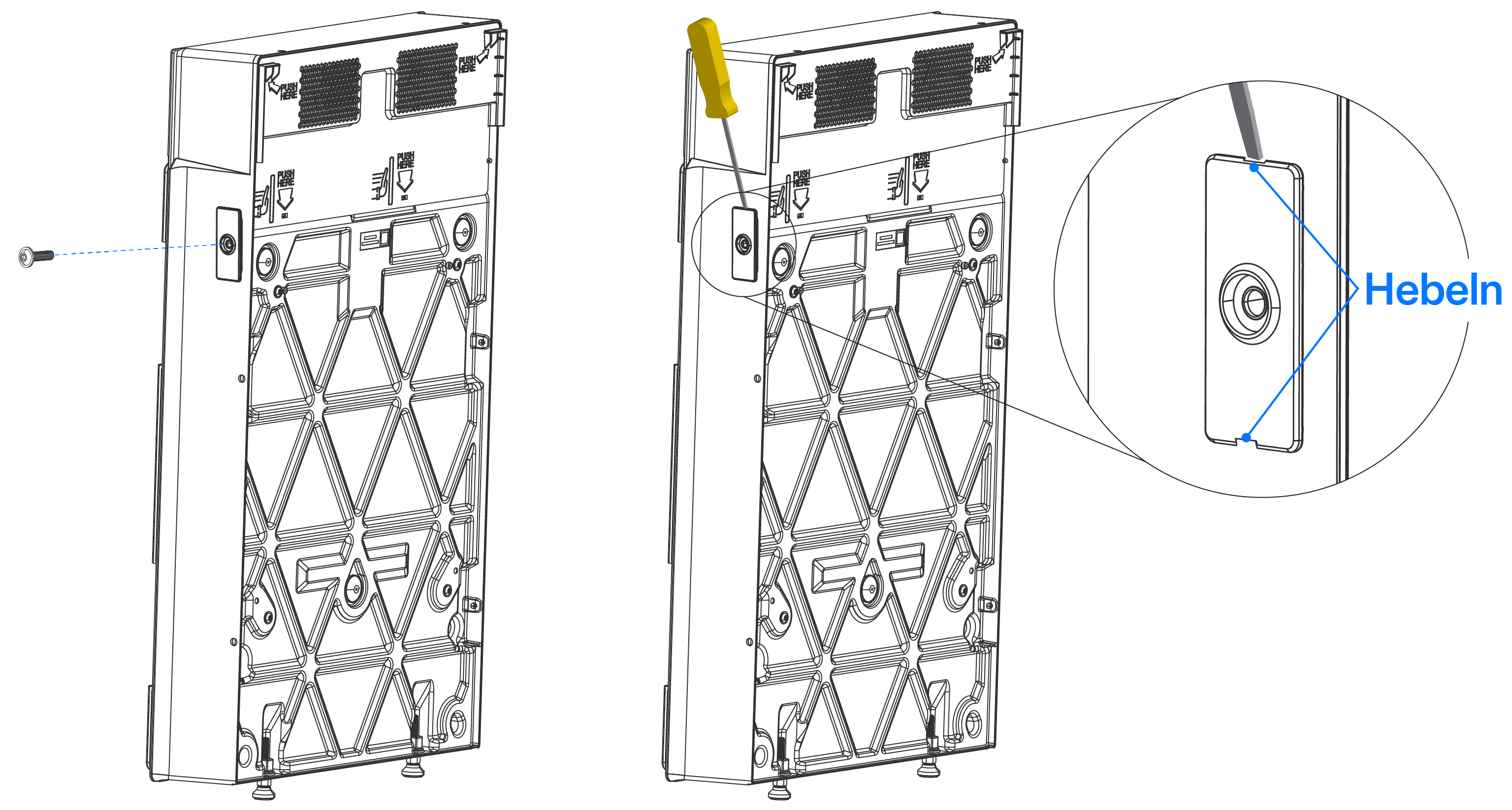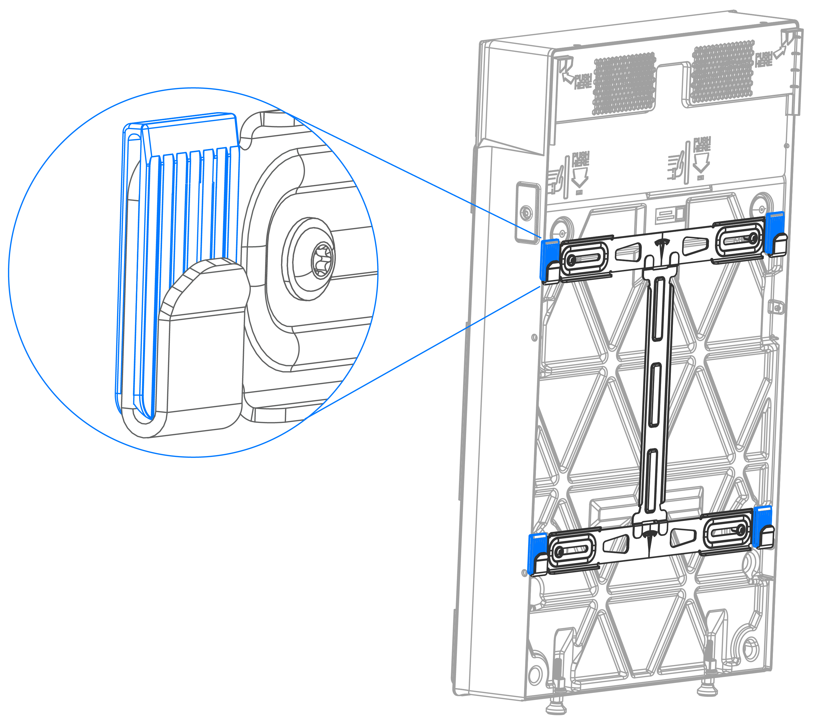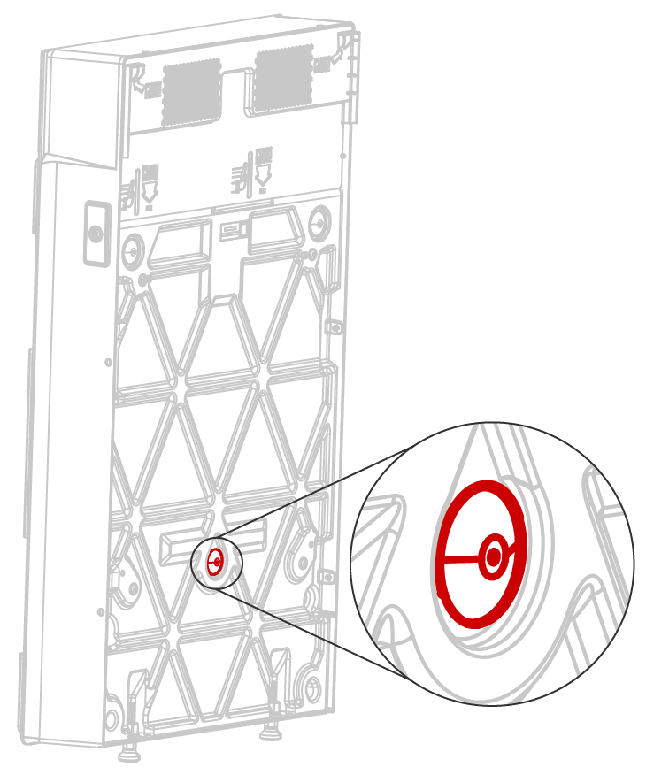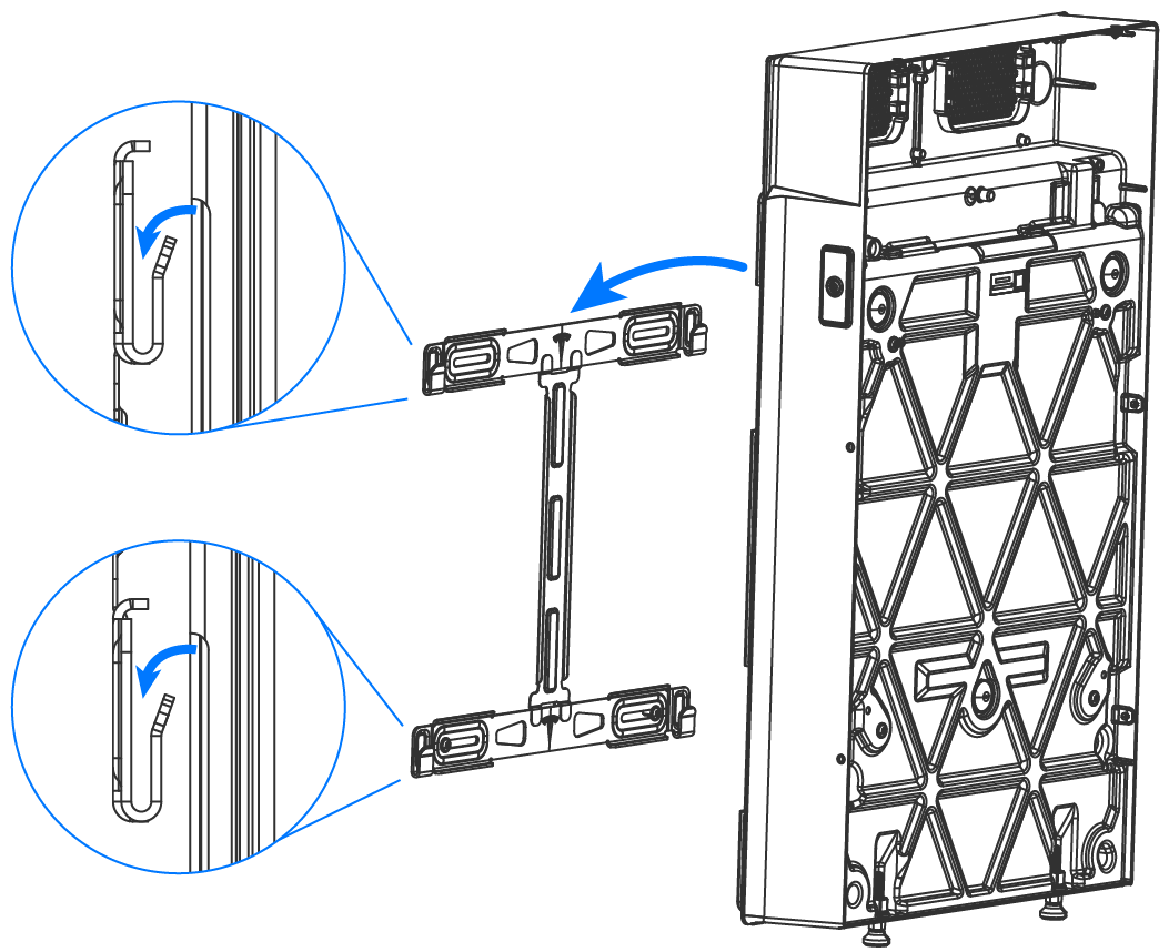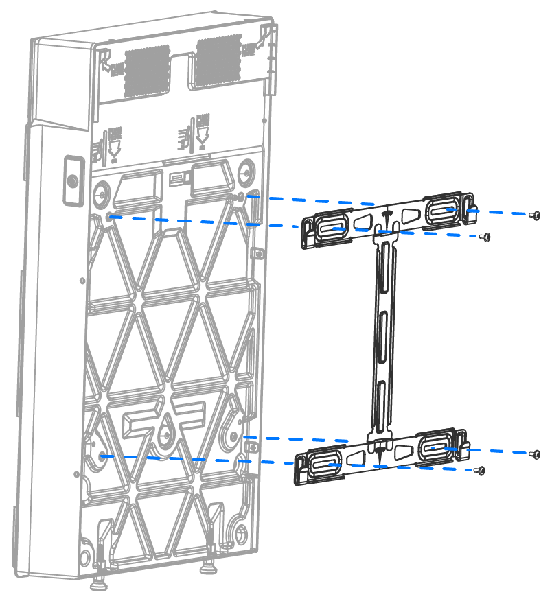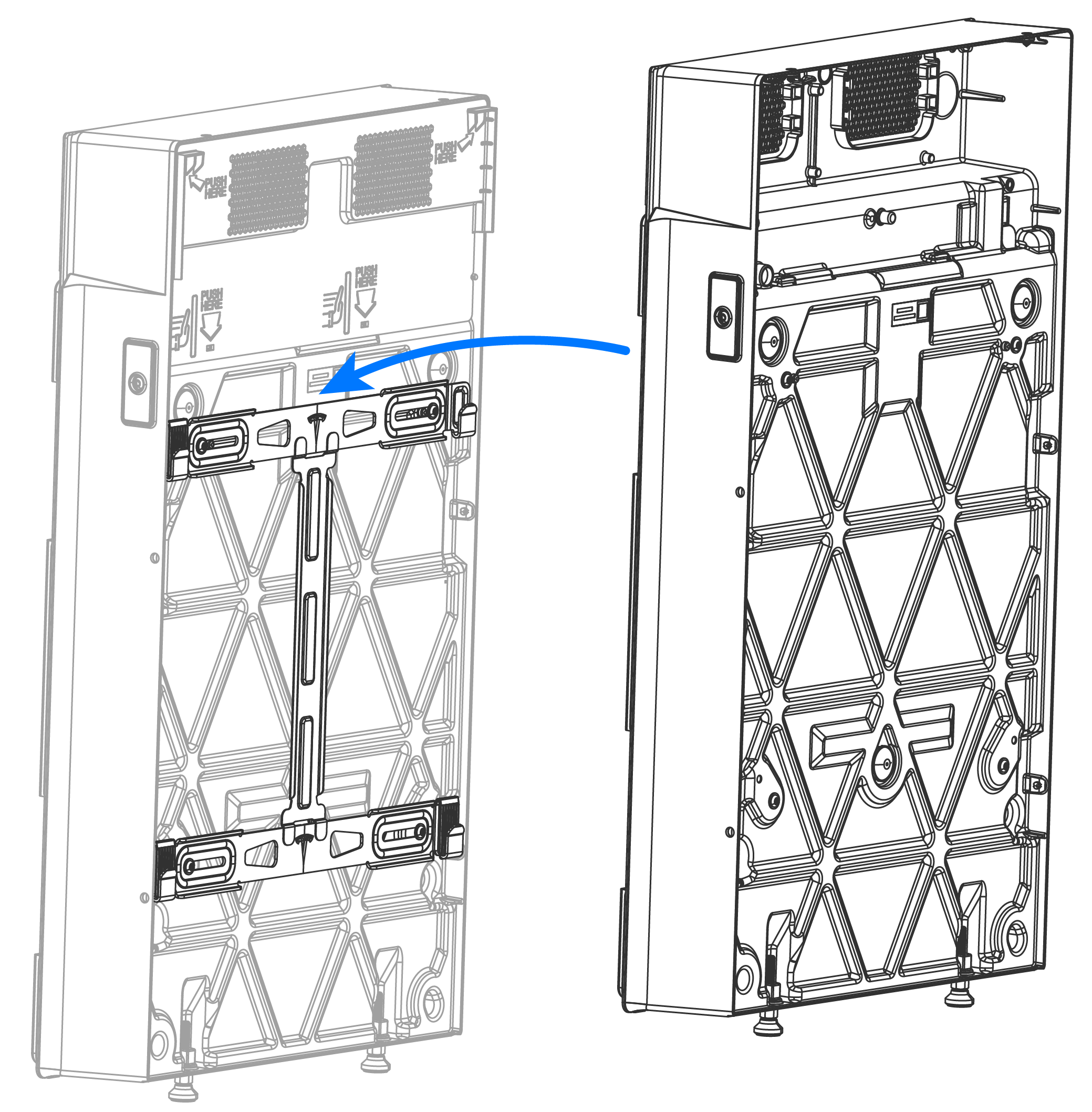 - Schieben Sie die Sackkarre mit dem nächsten Expansion (Erweiterung)sgerät darauf an die Wand und positionieren Sie das Gerät so, dass die Befestigungslaschen direkt über den Aufnahmen der Halterung liegen.