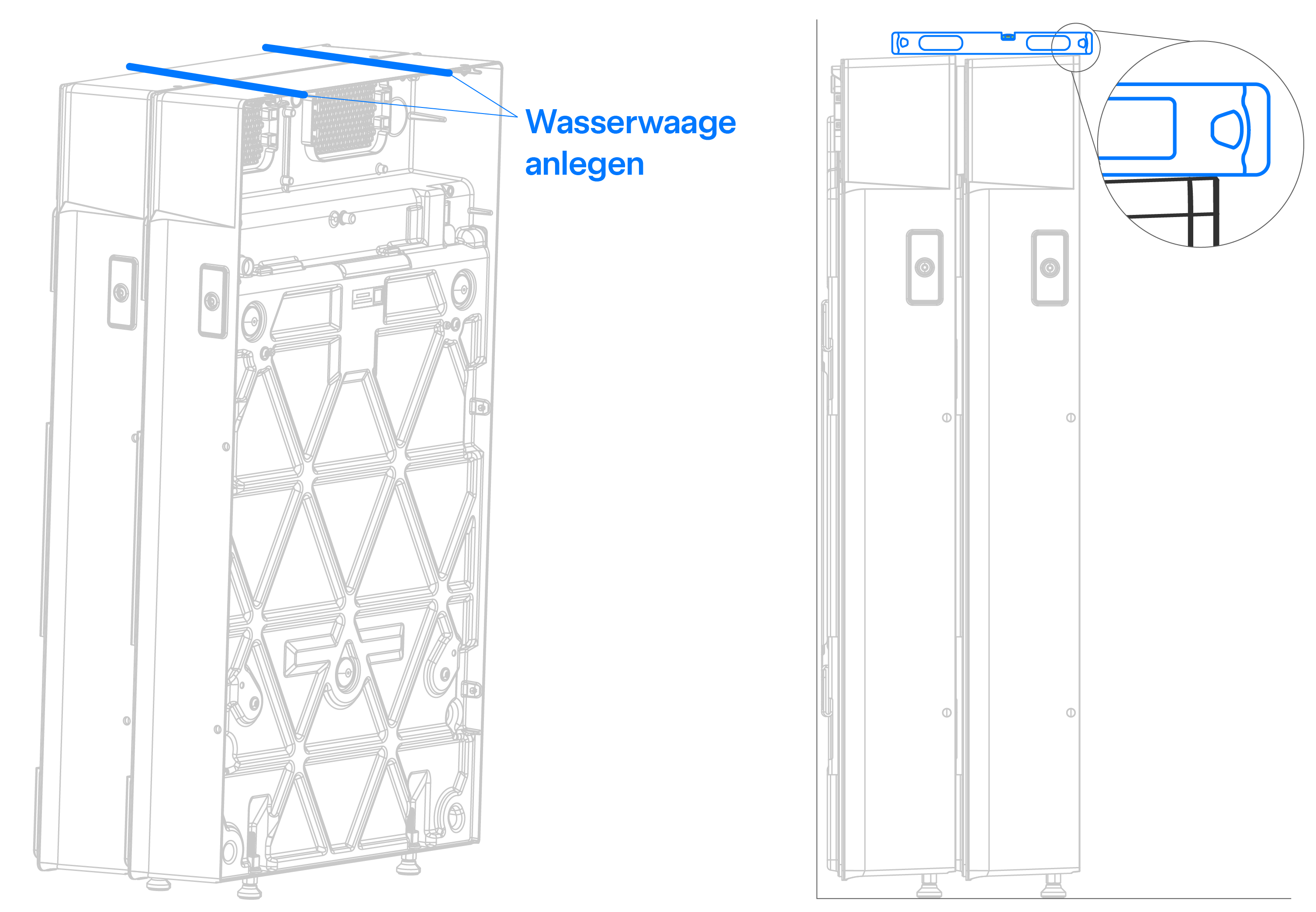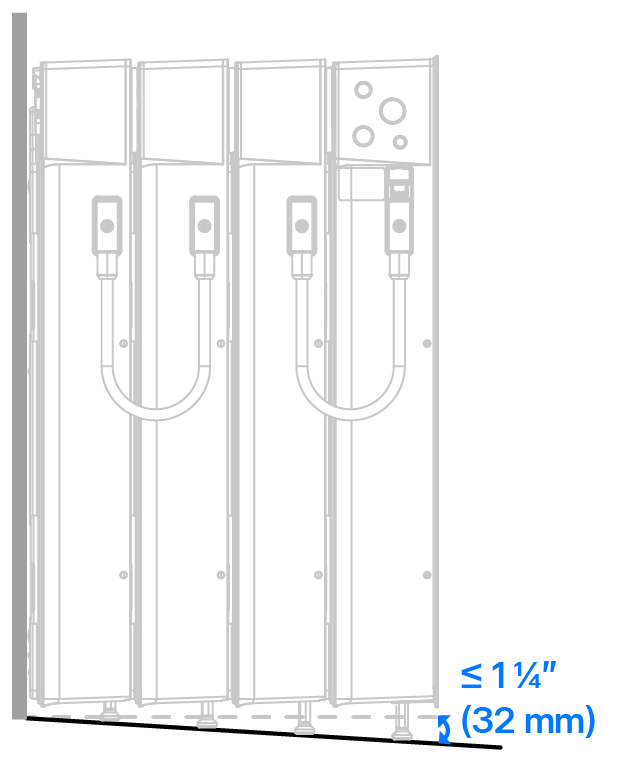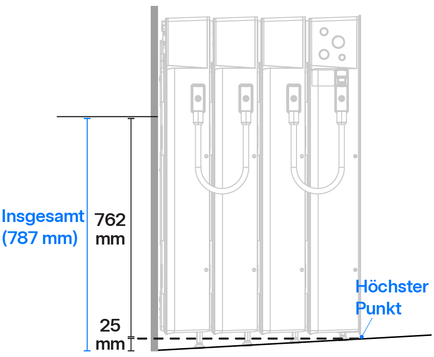Höhe der Wandhalterung bei einer ebenen Oberfläche oder wenn der Boden von der Wand weg geneigt ist Höhe der Wandhalterung, wenn der Boden zur Wand hin geneigt ist WarnungEs ist von größter Wichtigkeit, dass die Neigung des Installationsbereichs genau gemessen wird und die Wandhalterung in der richtigen Höhe angebracht wird, um sicherzustellen, dass die Einheiten nivelliert werden können und die gestapelte Baugruppe ihre strukturelle Integrität beibehält.- Wenn die Wandhalterung zu niedrig angebracht ist, greifen die Geräte nicht korrekt in die Wandhalterung ein.