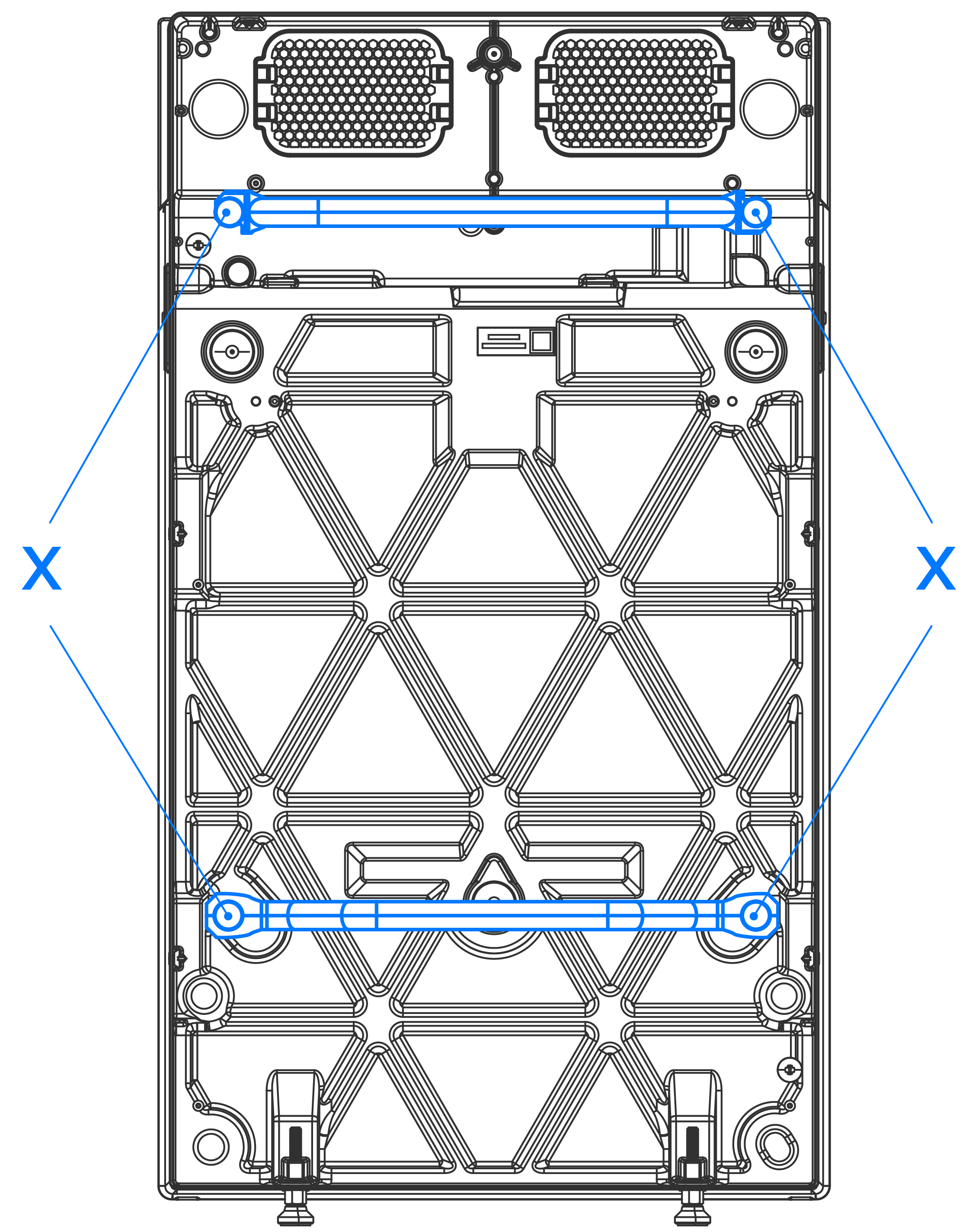 - Um das Expansion (Erweiterung)-Gerät anzuheben und zu transportieren, befolgen Sie alle Anweisungen zur Verwendung der Powerwall-Sackkarre im SCHRITT 2: Auspacken der Powerwall 3 und Transportieren mit der Powerwall-Sackkarre und beachten Sie, wo die beiden Hebegriffe an der Expansion (Erweiterung) (X) angebracht sind: