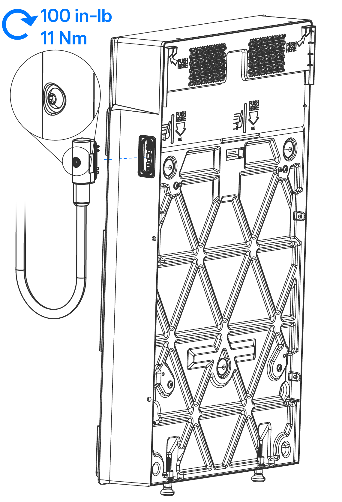 - Entfernen Sie die Expansion (Erweiterung)sport-Abdeckung von der Powerwall 3 (oder dem anderen Expansion (Erweiterung)-Gerät) und stecken Sie den Erweiterungskabelbaum ein. Ziehen Sie die T40 Kabelbaumschraube am Steckverbinder mit einem Drehmoment von 11 Nm (100 in-lb) an.