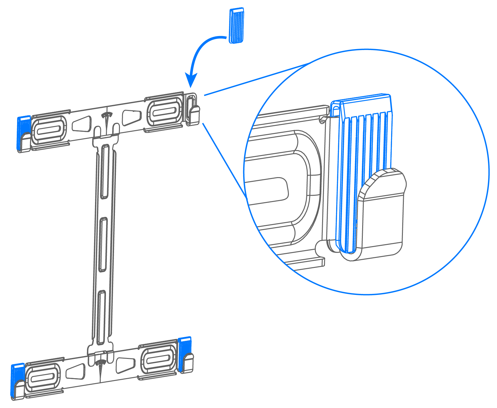 - Setzen Sie die (6) Tannenbaumclips in die Befestigungsbohrungen oben und an den Seiten des Gehäuses ein.