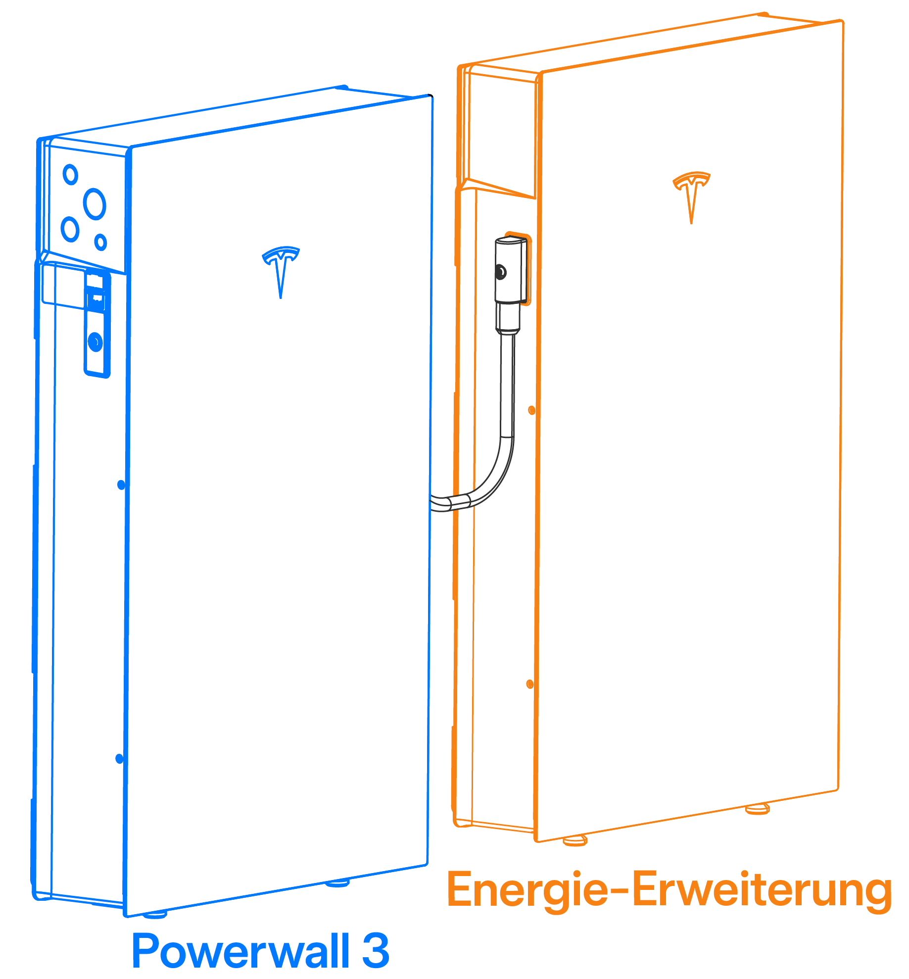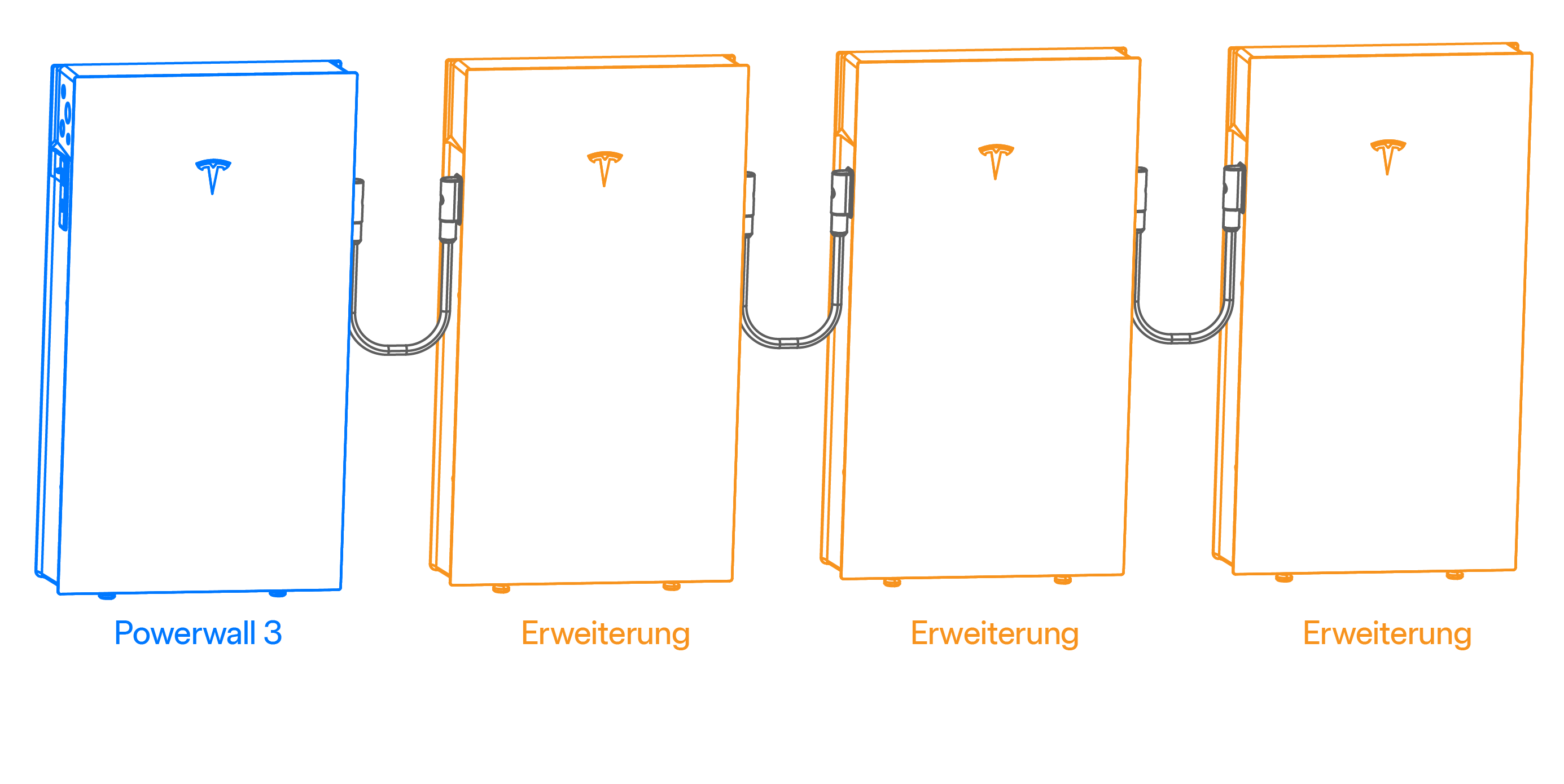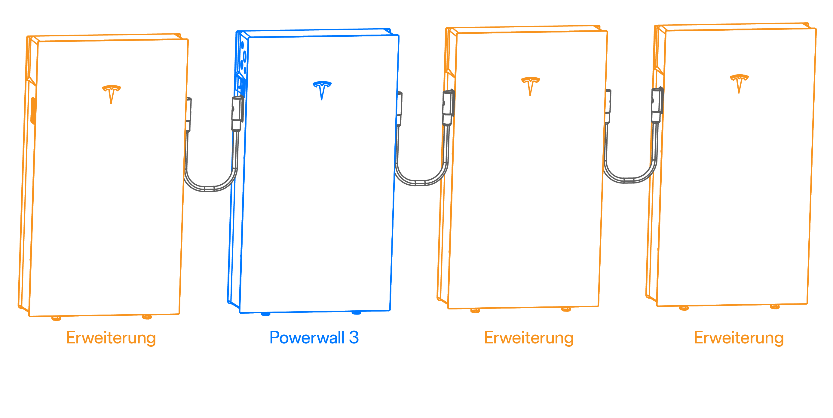 - Expansion (Erweiterung) Verbindung: Expansion (Erweiterung) sgeräte können an eine Powerwall 3 oder andere Expansion (Erweiterung)sgeräte nur über den Expansion (Erweiterung)skabelbaum (siehe Expansion (Erweiterung) Kabelbaum) angeschlossen werden. Jedes Gerät (Powerwall 3 und Expansion (Erweiterung)) verfügt über (2) Erweiterungsanschlüsse, je einen an jeder Seite des GehäusesAnmerkungDie Expansion (Erweiterung)sgeräte sind elektrisch mit einer Powerwall 3 parallel geschaltet.