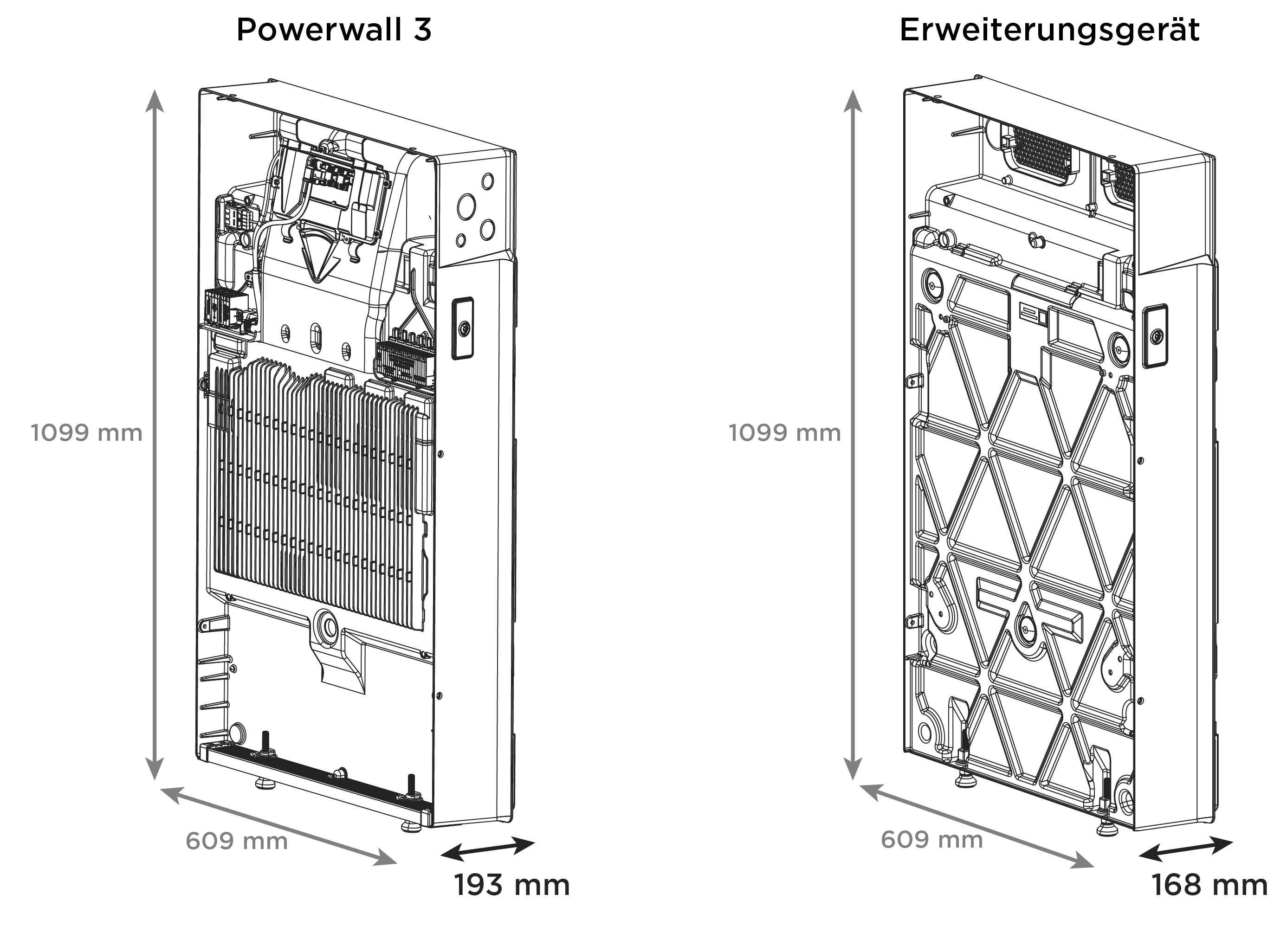 - Abmessungen: Das Expansion (Erweiterung)-Gehäuse hat die gleiche Höhe und Breite wie die Powerwall 3, ist jedoch 25 mm (1 Zoll) schmaler als die Powerwall 3 (siehe Abbildung)