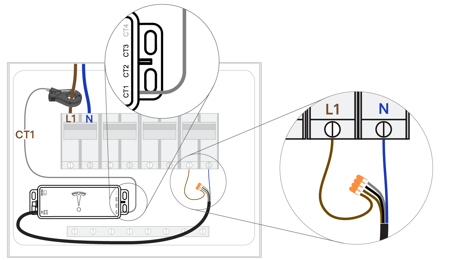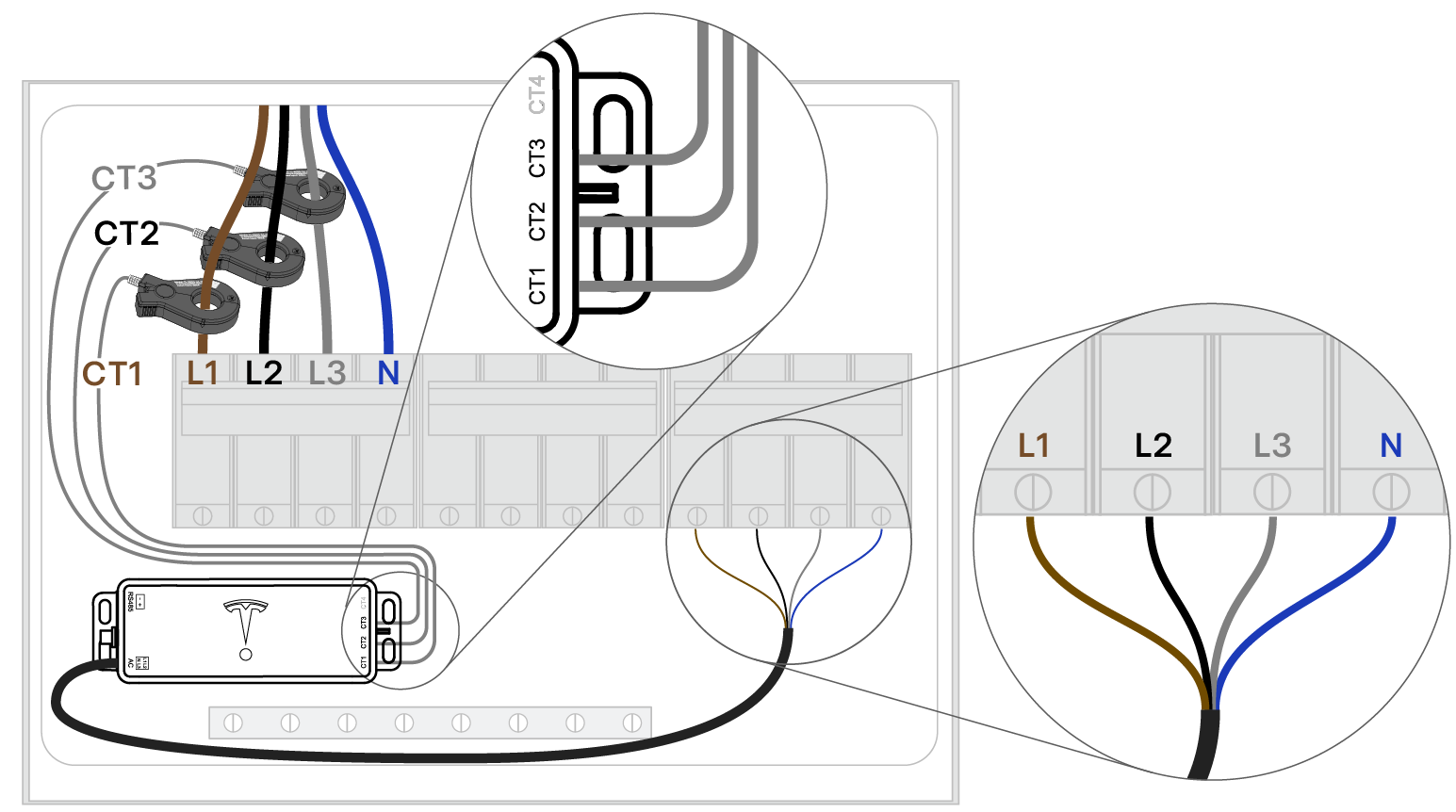Unabhängig von der Art des Netzes, an das dieses System angeschlossen ist, muss die Tesla Remote-Stromzähler immer an L1 und N angeschlossen sein. Wenn der Zähler an L2 und/oder L3, aber nicht an L1 angeschlossen ist, wird er nicht mit Strom versorgt.