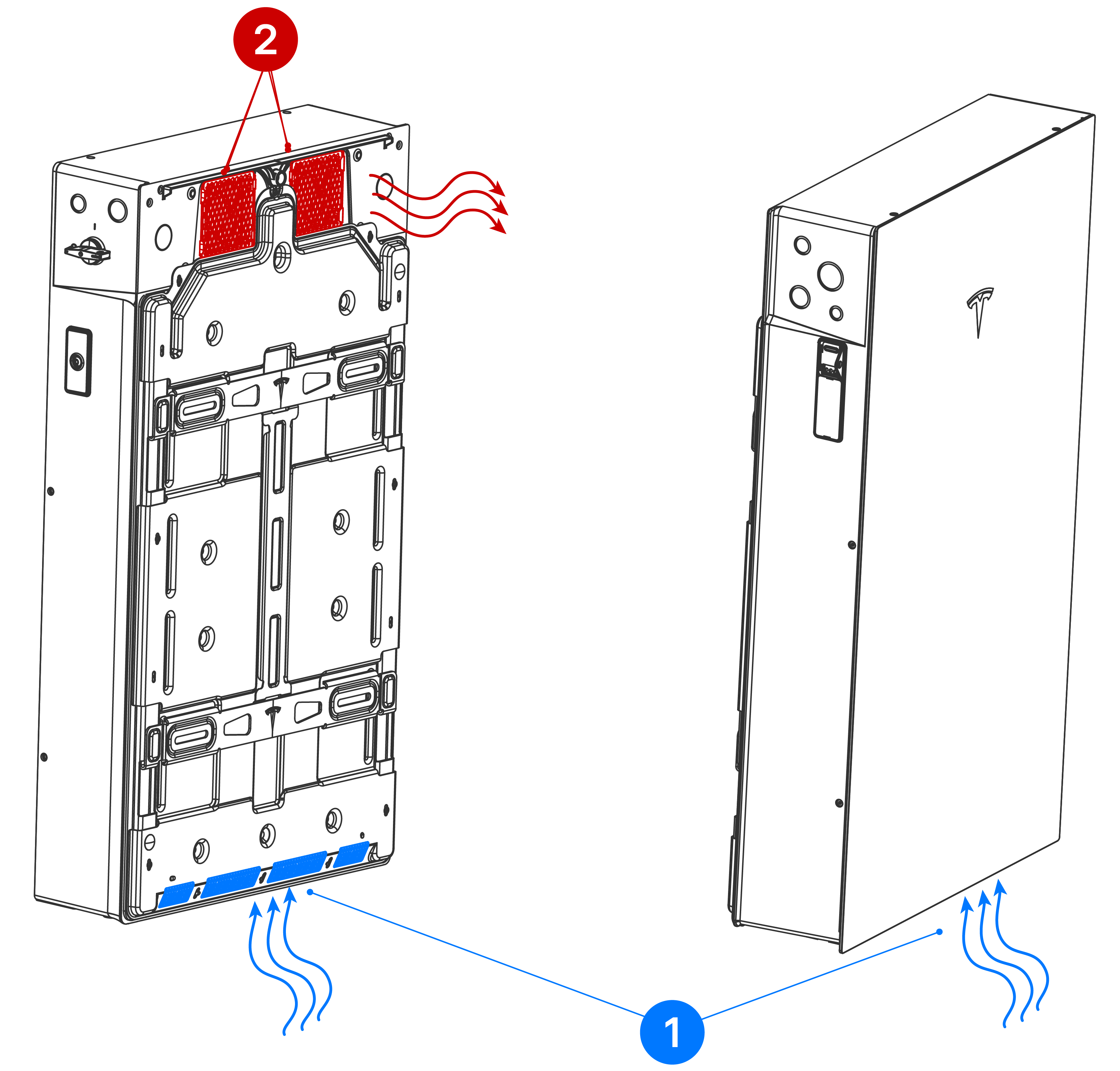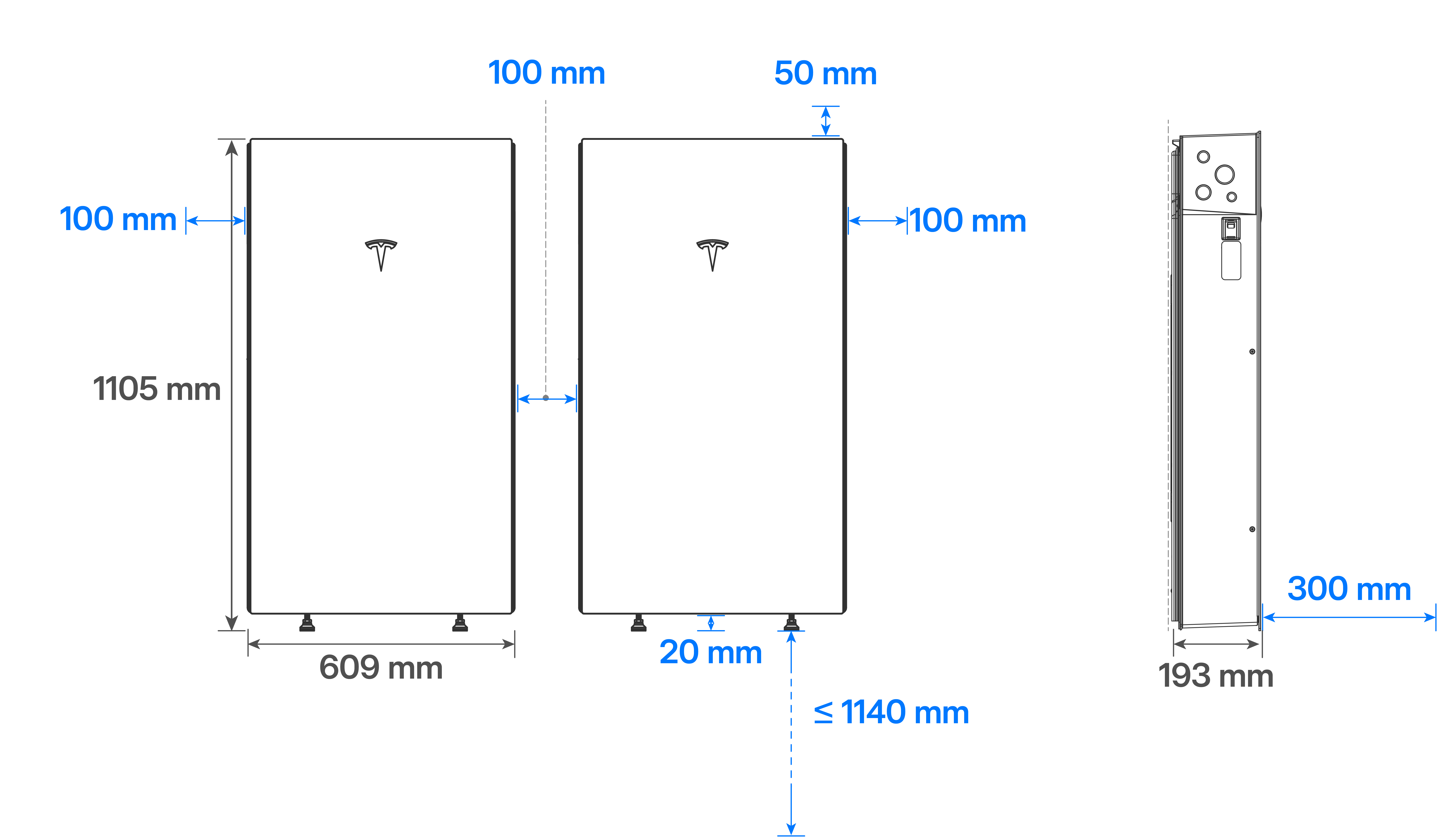 1 Tesla empfiehlt ein Minimum von 150 mm zwischen nebeneinander installierten Geräten, um einen ausreichenden Abstand zur Verdrahtung und Zugang zum Ein/Aus-Schalter sicherzustellen.