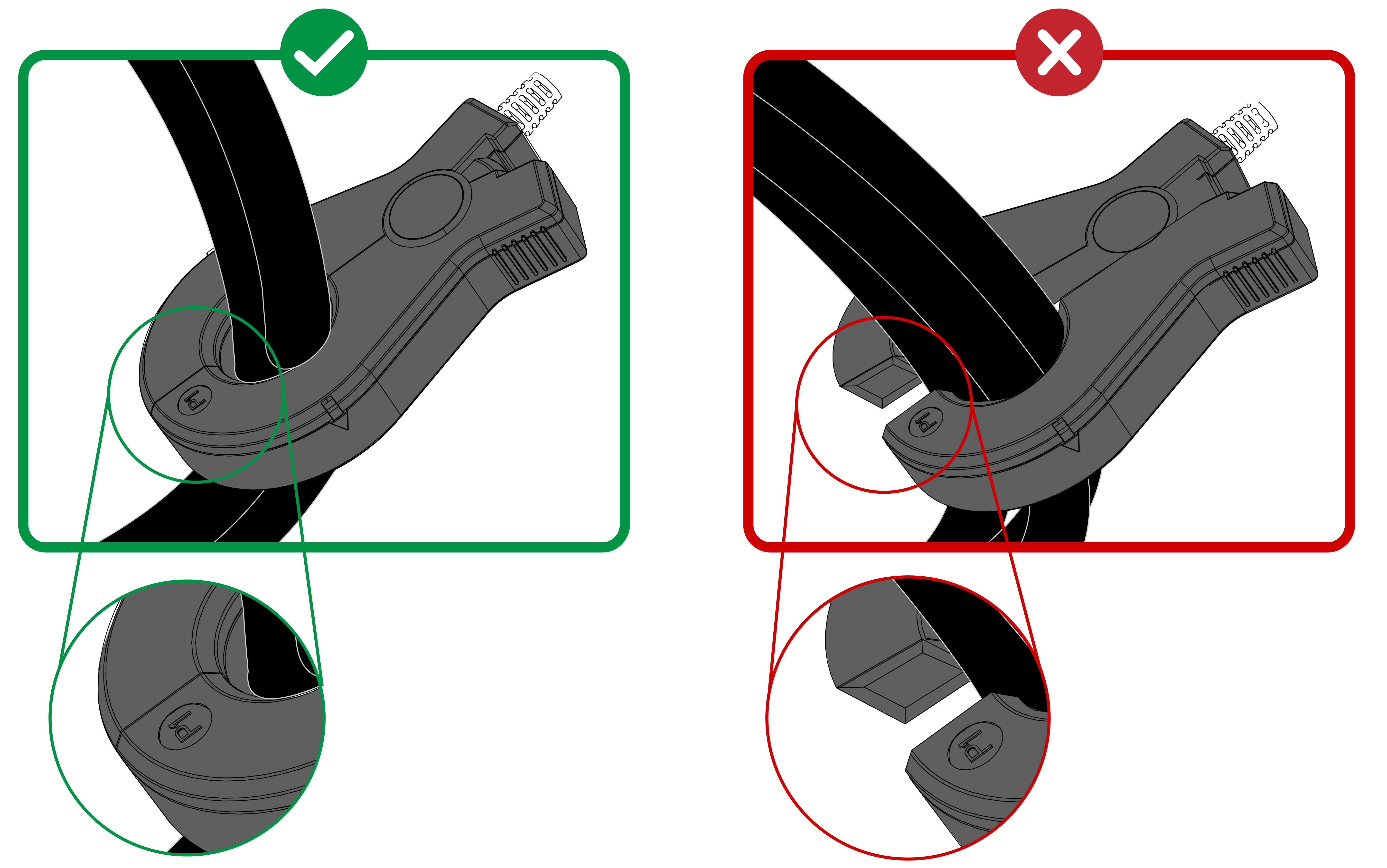 - Drücken Sie den Stromwandler zusammen, um ihn zu öffnen, und schließen Sie ihn dann um den/die zu messenden Leiter herum.AnmerkungInstallieren Sie den Stromwandler unbedingt so, dass die Seite mit dem weißen Text auf dem Stromwandlergehäuse zur Stromquelle zeigt (Netzeingang/ Stromnetz für Anlagen-Stromwandler, Solaranlagen-Wechselrichter für Solaranlagen-Stromwandler). Stets durch Beobachten des Leistungsflusses in der Tesla One-App überprüfen, ob sich die CTs in korrekter Ausrichtung befinden.