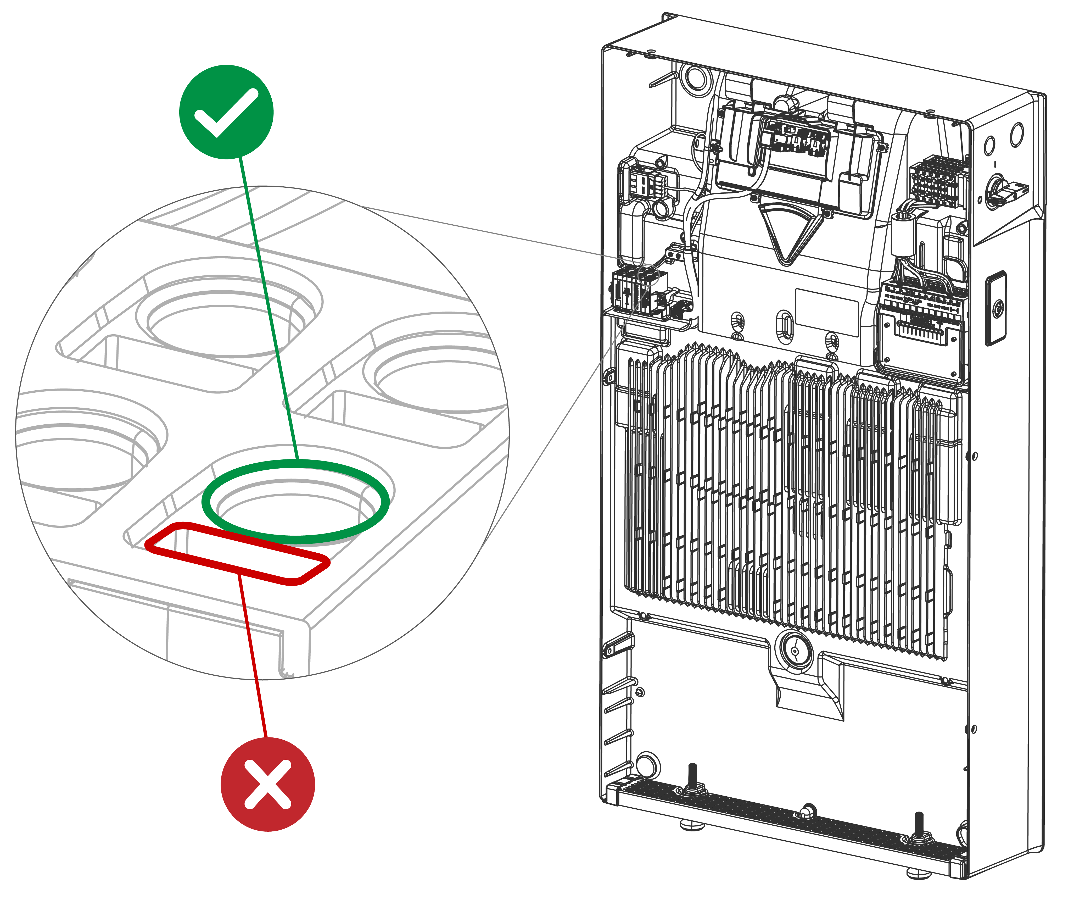 - Führen Sie die AC-Phasen-, Neutral- und Schutzerdeleiter durch die Kabelführung oder die Kabelverschraubung. Führen Sie die Leiter an die entsprechenden Klemmen und formen Sie aus dem überschüssigen Kabel eine Schlaufe.