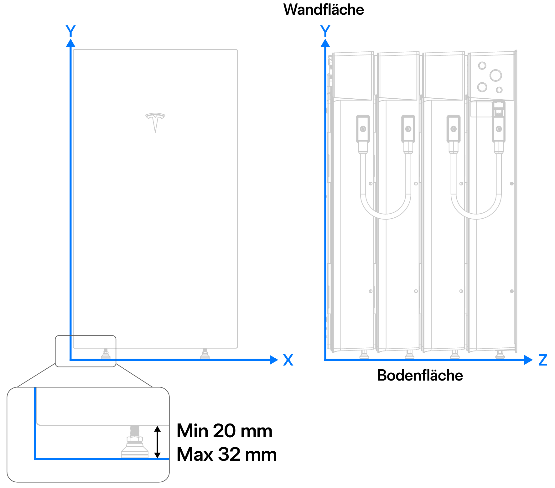 *Bei diesen Maßen befinden sich die Powerwall 3-/ Expansion (Erweiterung)-Füße auf der niedrigsten Höheneinstellung. Die Füße können bis zu 12 mm in der Höhe verstellt werden.