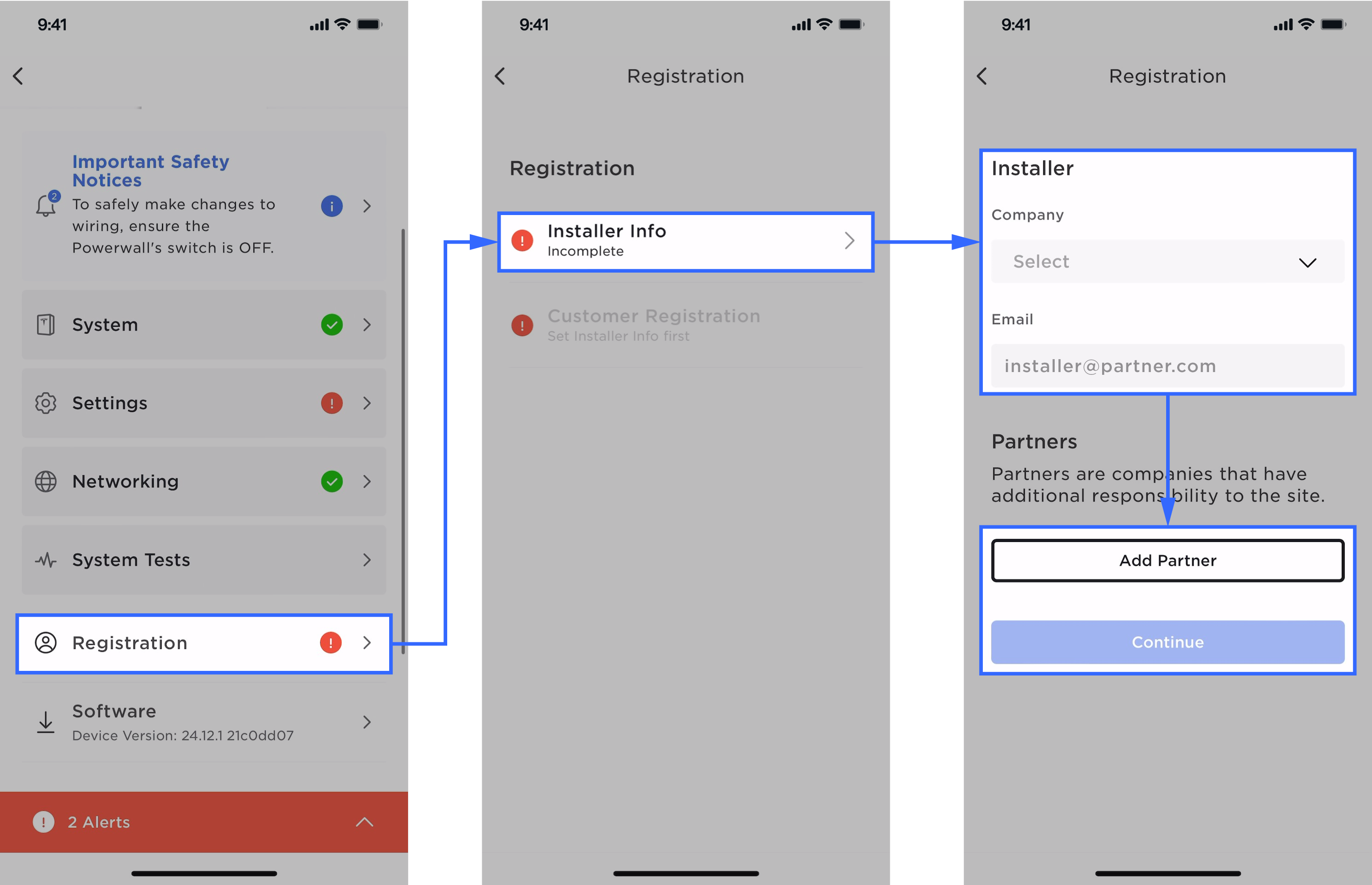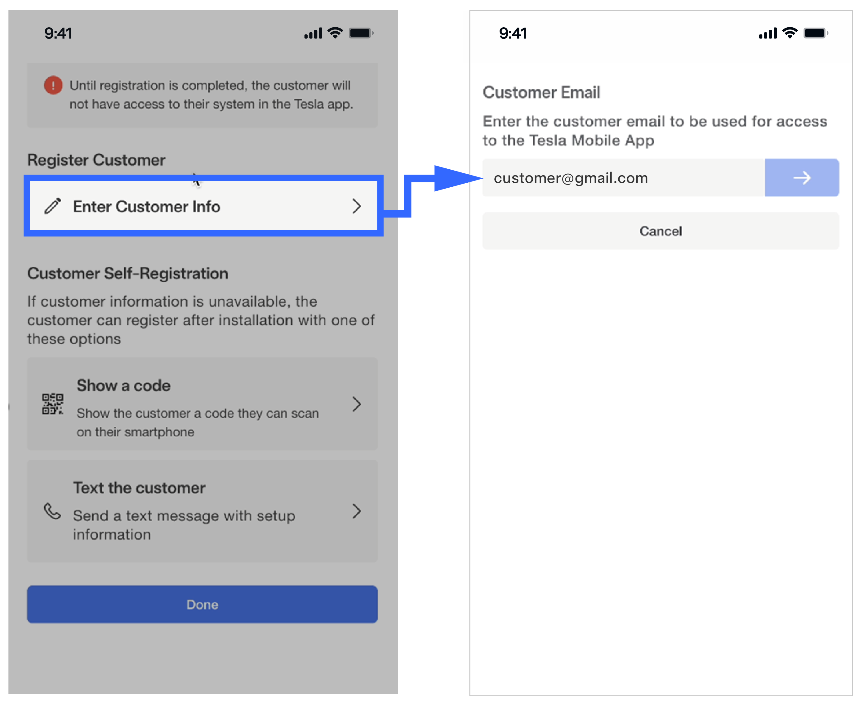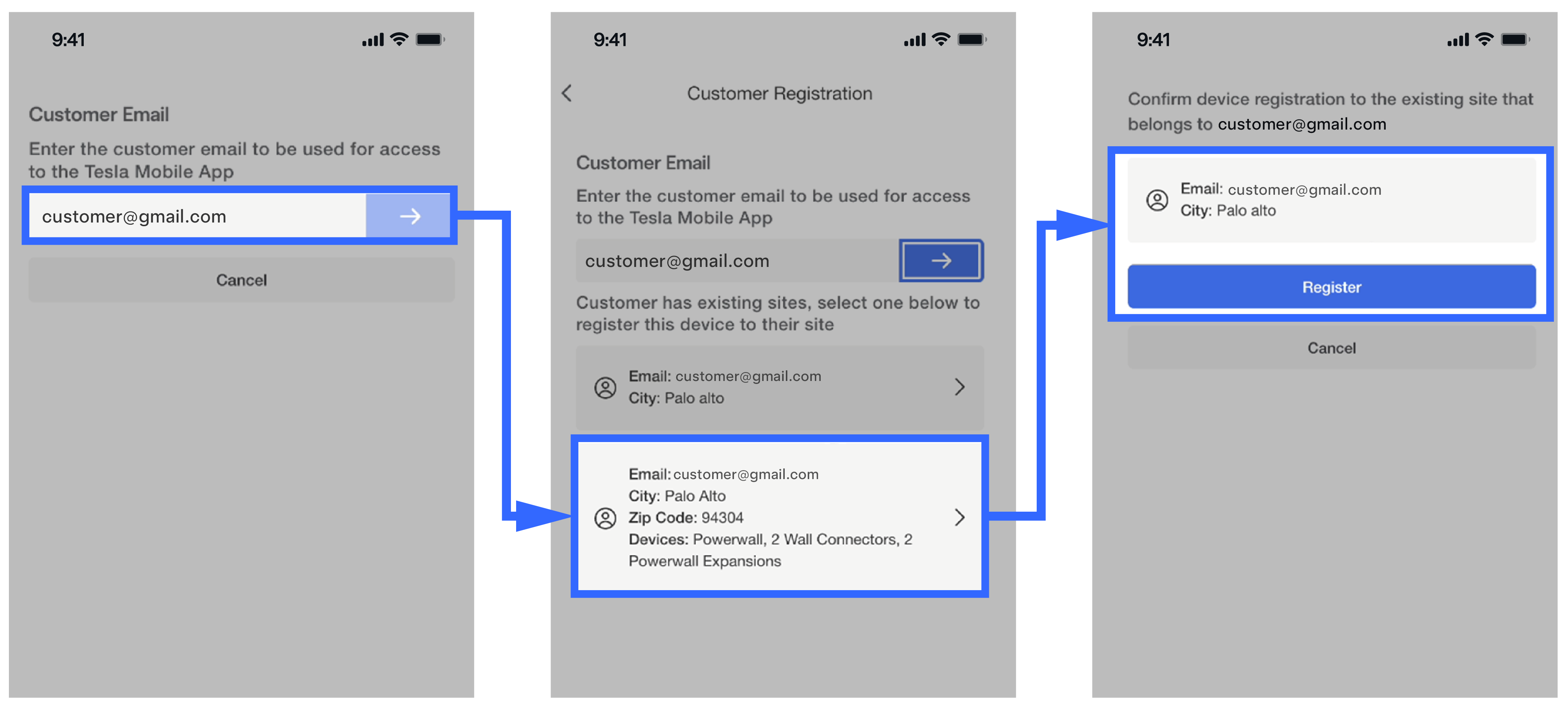 NoteCustomer registration is the action that triggers the API call to the cloud, which transmits the new device configuration for the site. This will ensure the customer can see the updated site in their Tesla Mobile App, and the Partner(s) can see the correct device in Powerhub.