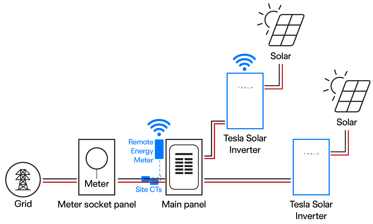 For solar-only systems with multiple Tesla Solar Inverters, Site metering is accomplished using a Neurio Remote Energy Meter paired with one of the Tesla Solar Inverters.