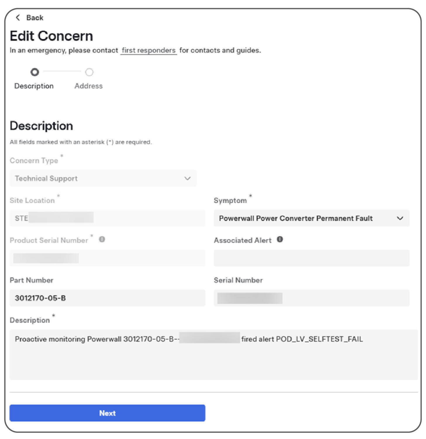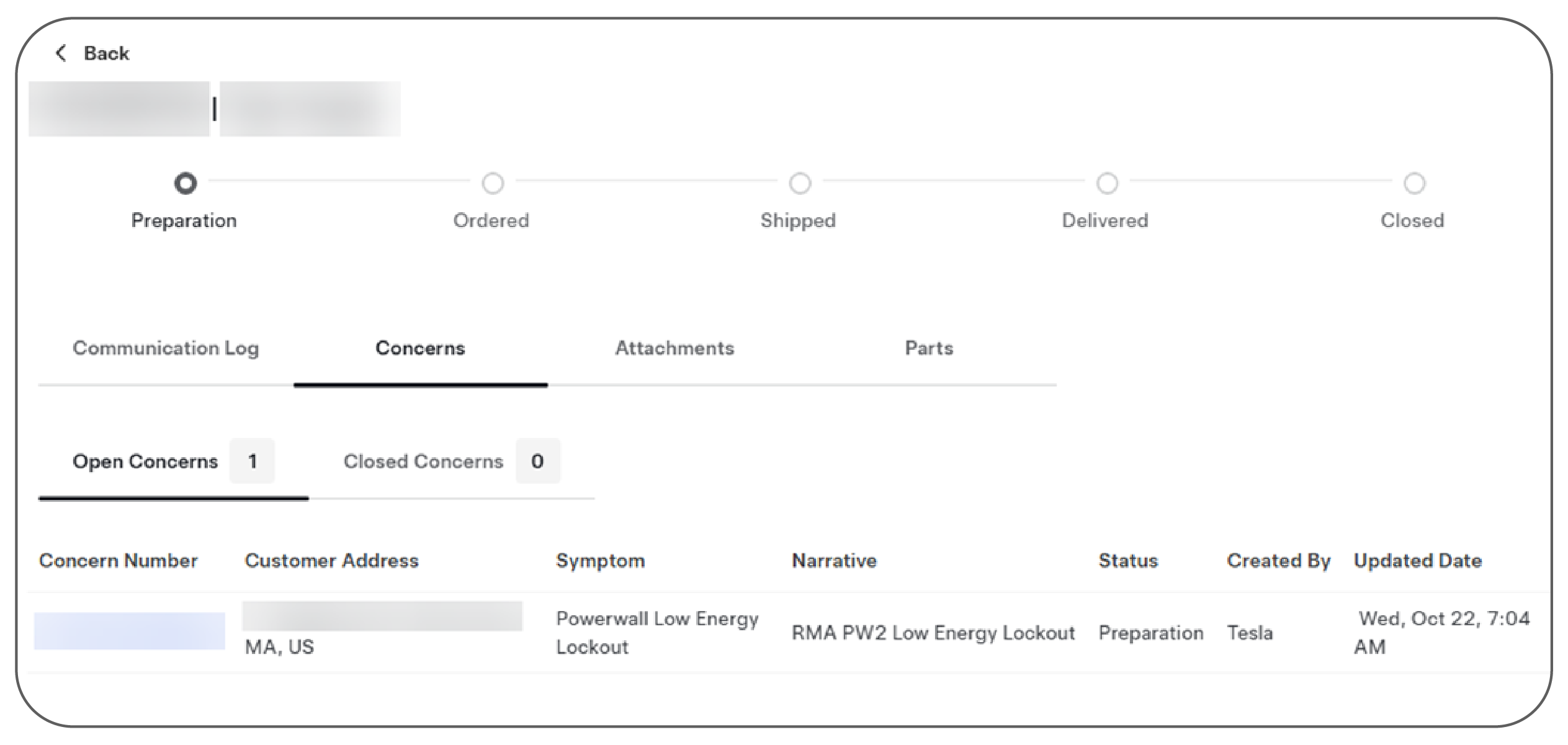 Once the ticket has been submitted, Tesla will order the replacement part to be shipped to the New Part Delivery address. Search for the AC or SV number in Energy Service Portal to find the current status, tracking information, and delivery status of the new part.