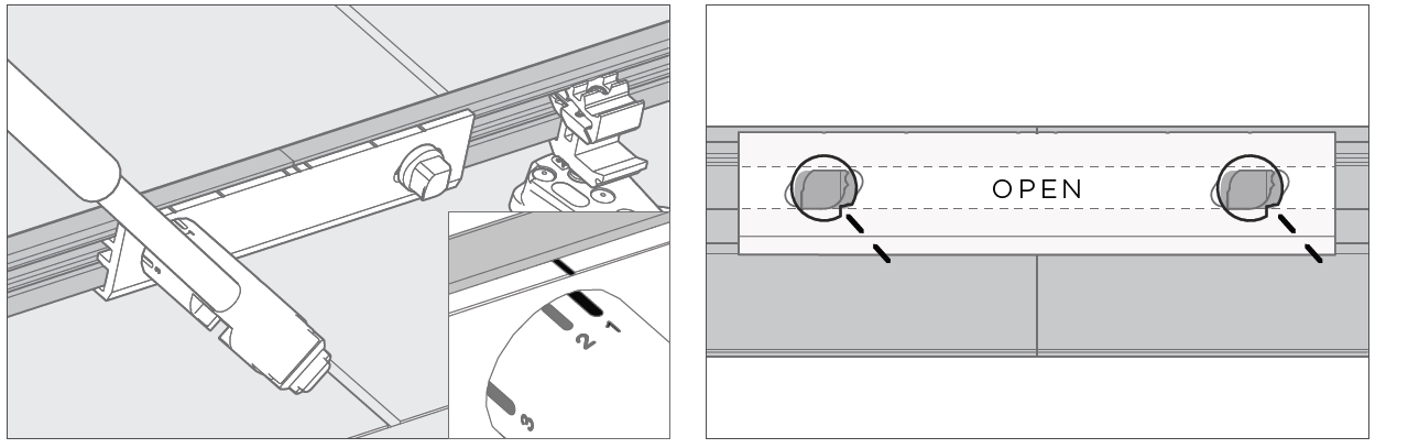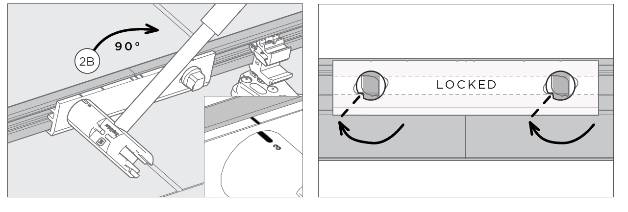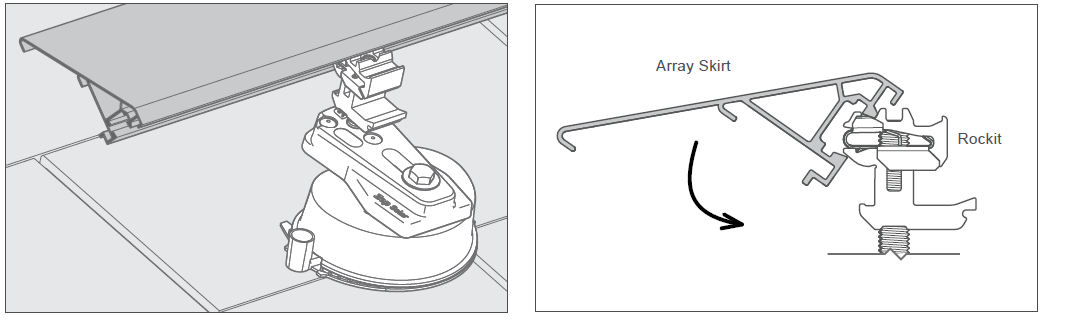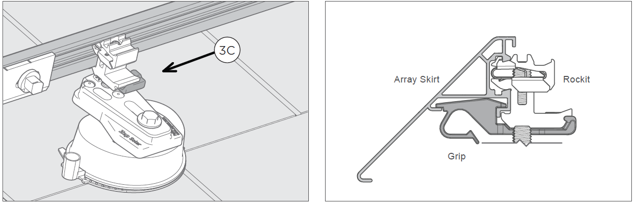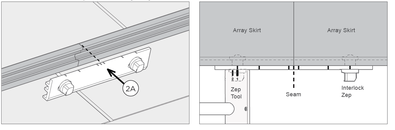 Place and center an Interlock over the seam of the two Array Skirts, using timing marks as shown (2A). Use the Zep Tool to rotate Interlock Zeps from Position 1 to Position 3 (2B). The outside edge of the Array Skirt should line up with the array perimeter. Complete the Skirt by installing additional Array Skirts with Interlocks.