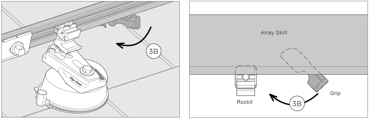 Insert Grip into Grip Slot on underside of Array Skirt. Grips are installed to the RIGHT of the Rockit (3A). Rotate Grip parallel with the Rockit until it clicks into place (3B). Slide the Grip over the Rockit until it clicks into place (3C).