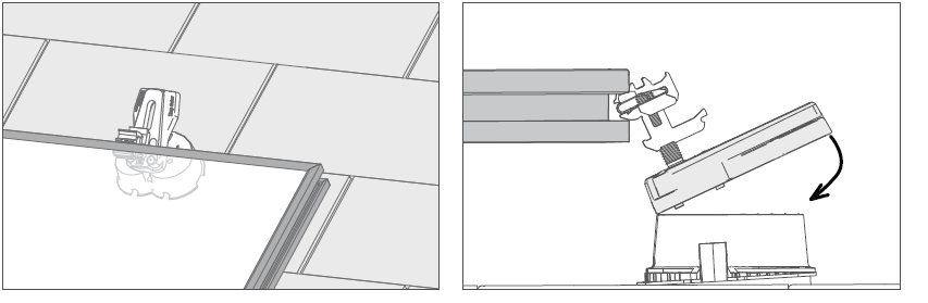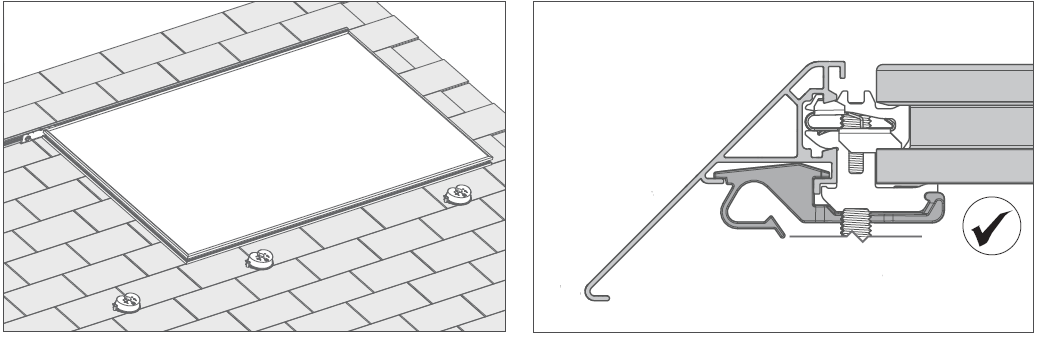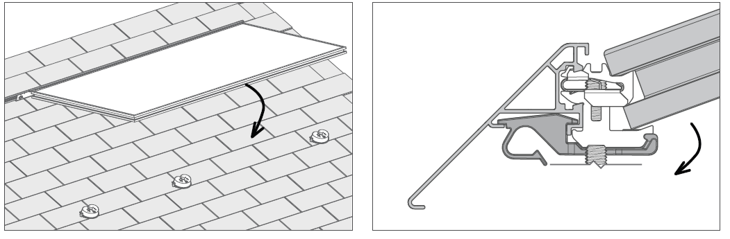 Position the first module on the tongue side of the front row Leveling Feet. Rock the module down. Forced interference between the Zep Groove of the module frame and the Rockit creates a structural and electrical bond without the need for additional fasteners.