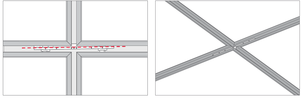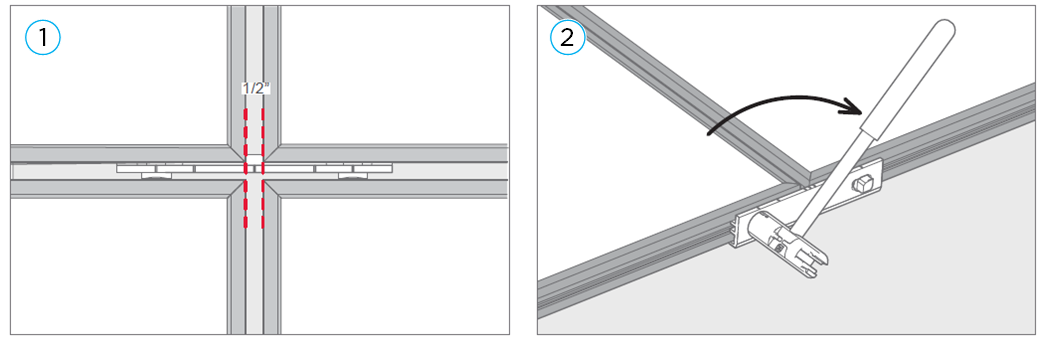 For the second module, align and center the Interlock on module edges. The standard gap between modules is 1/2 inch (1) with a total range of 3 inch (in case of inteference with the Leveling Foot). Use the Zep Tool to turn Interlock Zeps from position 1 to postion 3 (2). Tongue side of Interlock allows flexibility for small variations in module sizes. Allowable gap is still structurally electrically bonded. The farthest allowable position to align with module edge when shifting Interlock is shown below. Continue to install Modules, Leveling Feet and Interlocks until the array is complete. Be sure to “SKIMBL” every row.