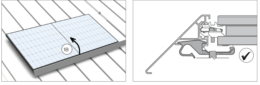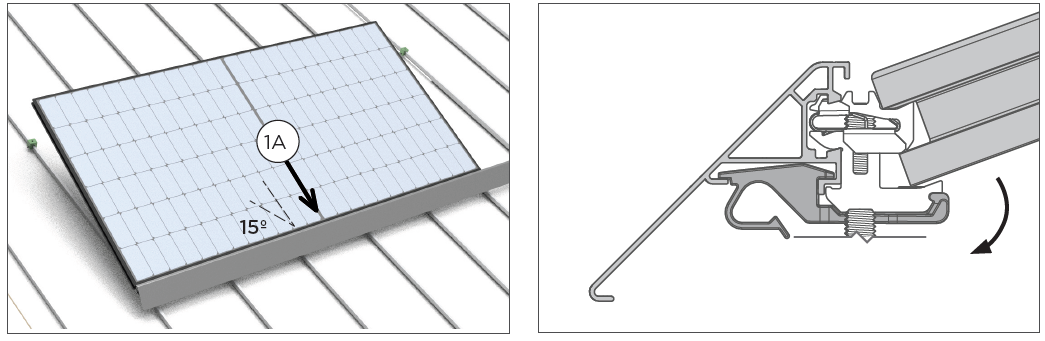 Position the first module on the tongue side of the front row Leveling Feet, the frame engages at 15 degrees (1A). Rotate module downward almost flat, while pushing module onto tongues of the Leveling Feet and Interlocks (1B). If needed, lift module up slightly, and apply force towards the Leveling Feet to seat the module completely.