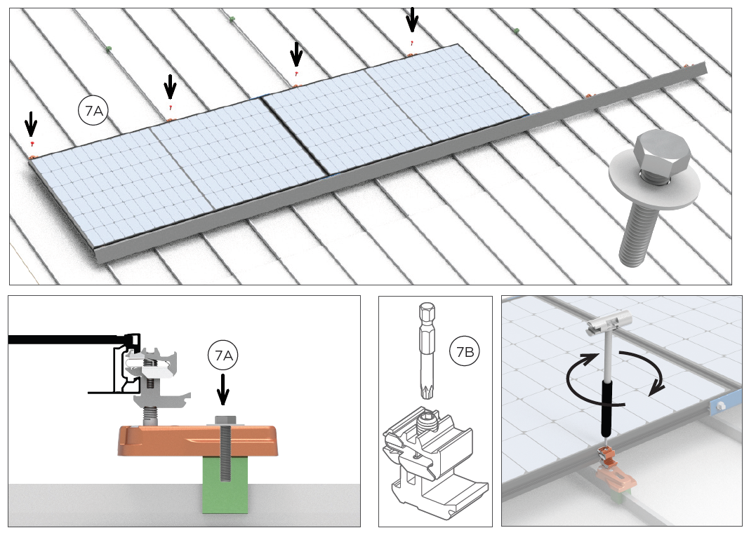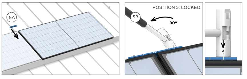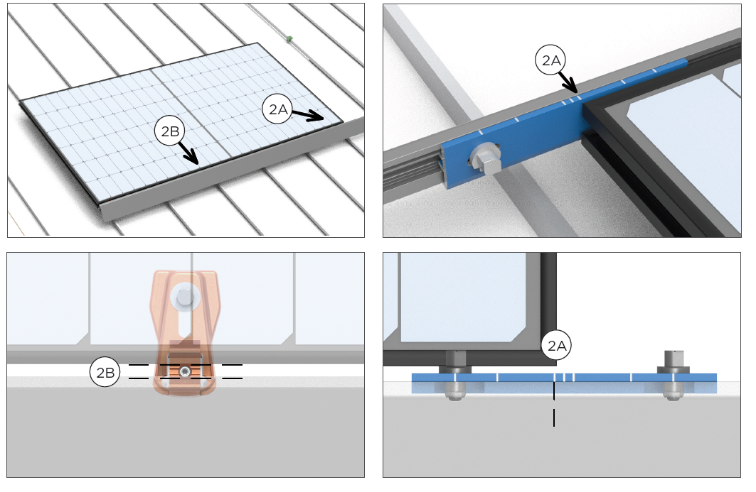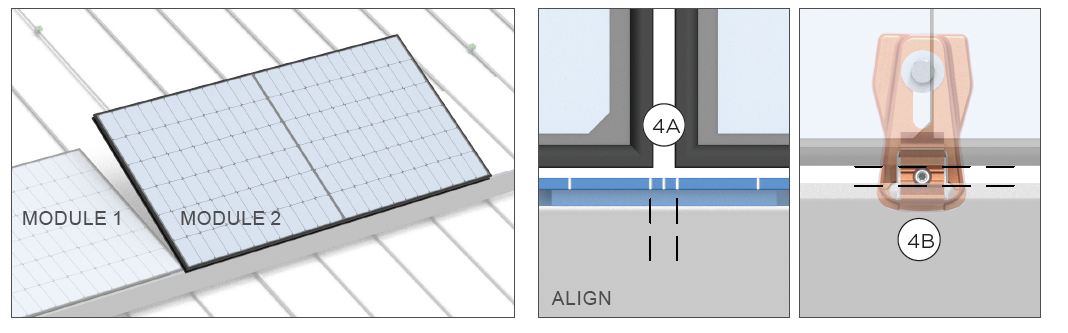 Install Leveling Feet at the back of the module at the locations of the Seam Mounts. Visually align and position the Leveling Foot (3A), then insert the Key side into the Zep Groove (3B). Do not fasten the Leveling Foot yet.