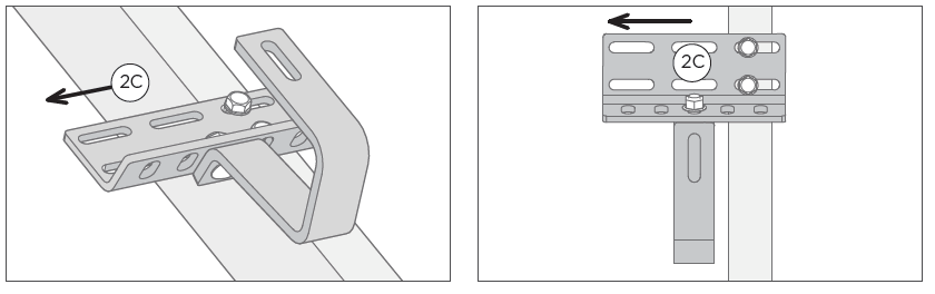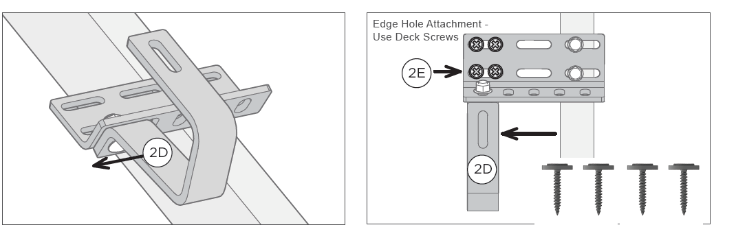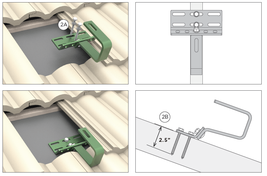 Install Mighty Hook through a rafter using two lag screws (2A). Minimum rafter penetration for lag screw is 2.5” (2B).