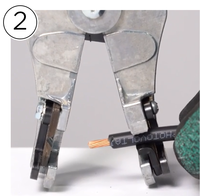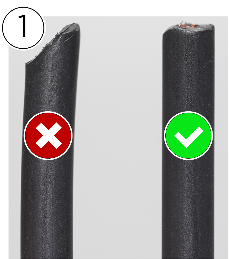 Cut wires at a perpendicular angle (1). Strip wires within the manufacturer's provided tolerance (2).