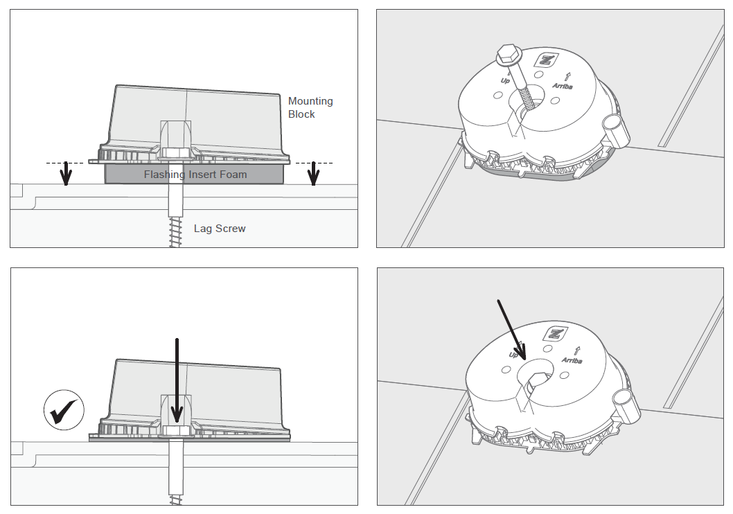 Insert the Captured Washer Lag into the Lag Slot in the Comp Mount. Point the Comp Mount uproof as indicated by markers. Lags without sufficient purchase, i.e. “spinners” REQUIRE removal, card flashing, and re-installation. Fasten the Comp Mount, compressing the foam all the way to ensure a complete seal. Flashing Insert Foam is used during installation to contain sealant and is NOT the principal barrier to water ingress.