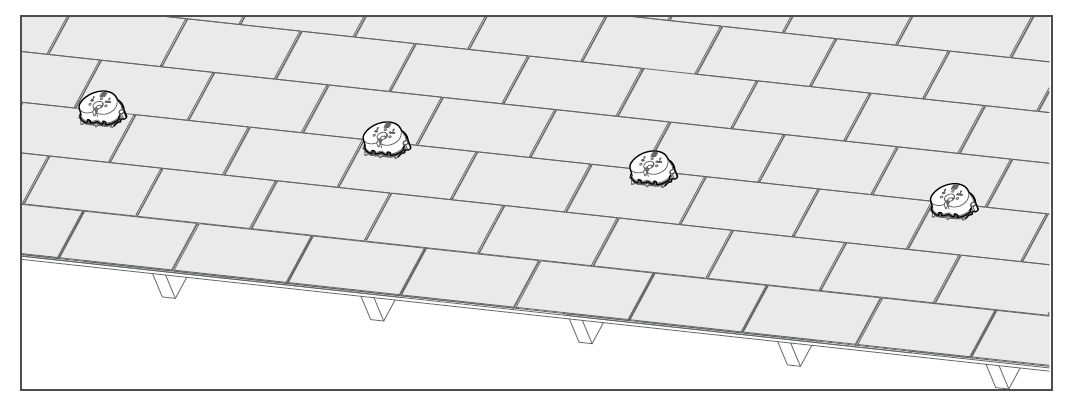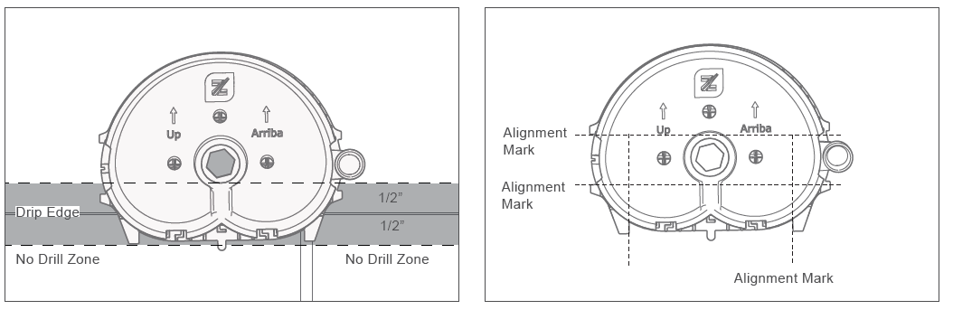 The Comp Mount can be installed anywhere along the drip edge, as long as the Captured Washer Lag placement is outside of the No Drill Zone. If Comp Mount falls over drip edge, apply bead of sealant onto the bottom of the Flashing Insert Foam to ensure a complete seal. Refer to the Approved Sealants section for a list of approved sealants. Penetrations located COMPLETELY WITHIN Alignment Marks have sealant coverage. Lags outside area of complete sealant coverage require card flashing.