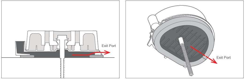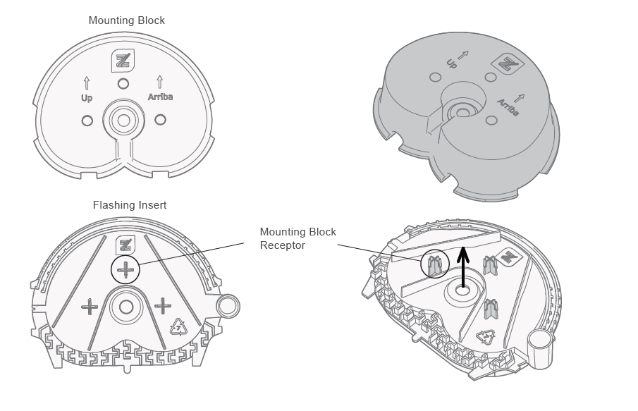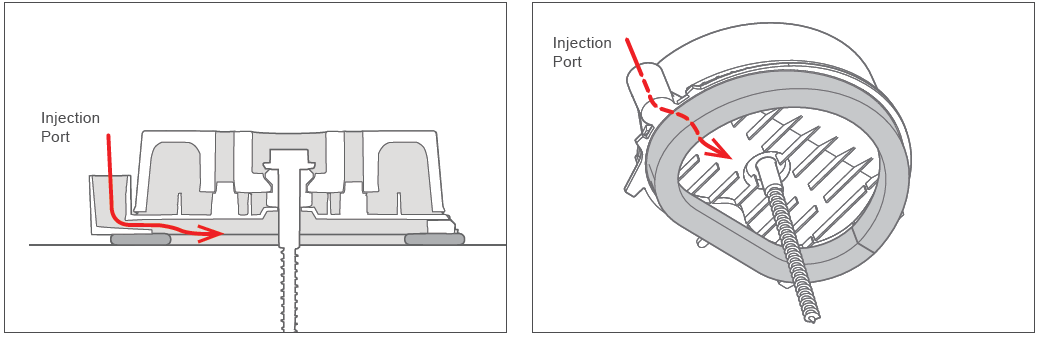 Inject moisture curable sealant through the Flashing Insert Injection Port. See Approved Sealants. Once the sealant completely fills the Flashing Insert, it will exit out of the Exit Port. If more than 7 full pumps are required, remove Comp Mount and seal manually. Sealant should be filled above edge of Injector Port to prevent pooling.