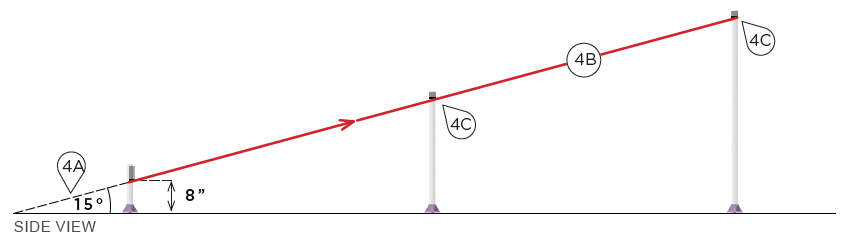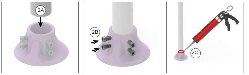 Insert the Mechanical Tubing into the Base Feet (2A) and fasten the Base Feet Set Screws (2B). Apply sealant between the Base Foot and Mechanical Tubing (2C). Refer to the Approved Sealants section for a list of approved sealants.