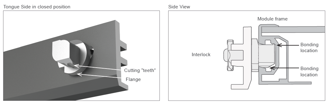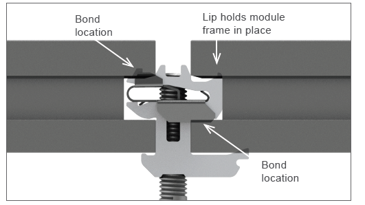 Forced interference between mating parts from module rock-in motion cuts into module frame for the range of allowable install positions, removing anodization and resulting in robust and UL certified bonding path.