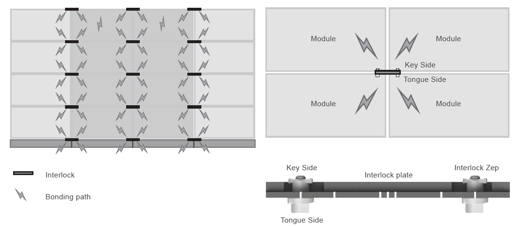 The Interlock bonds modules on all 4 sides and across the Interlock plate to create a hyper-bonded array where every module is structurally and electrically bonded to the surrounding modules.