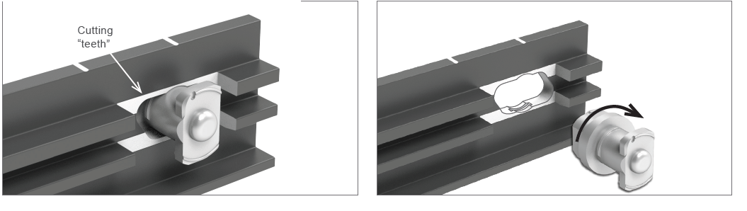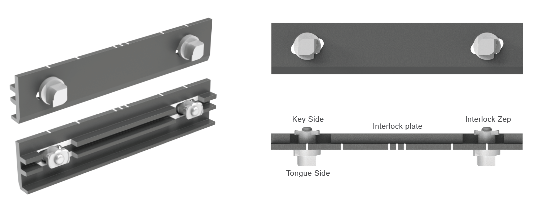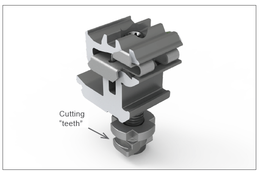 The rotating fastener attached to the Interlock plate, called the “Zep” or “Interlock Zep”, has two cutting teeth on the shaft that cut into the Interlock plate when the Zep is tightened during normal installation, resulting in robust and UL certified bonding path. The Interlock may be re-installed up to 15 times.