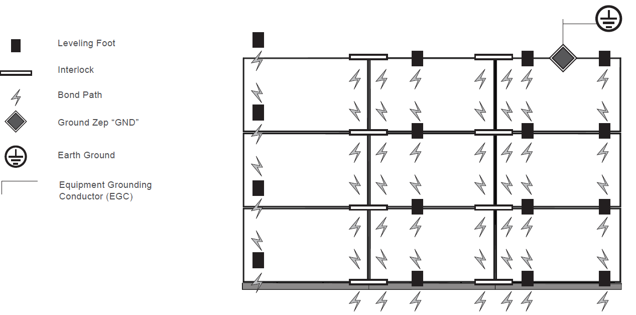 The following example shows a representative fault current ground path leaving a Tesla Zep Compatible™ array. Each Interlock and Cam Foot creates a bond between the module(s) and Array Skirt(s) it touches. The EGC path is carried through each module frame and Array Skirt. The fault current ground path then leaves the array through the Ground Zep. Typical Tesla Zep Compatible™ arrays will have multiple EGC paths, represented by the bond symbol below.