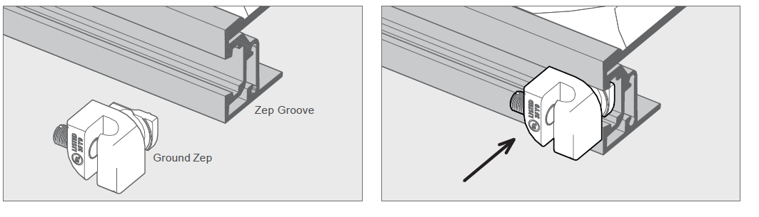 The Ground Zep provides a single point of connection for the Equipment Grounding Conductor (EGC) from the array to a building ground. Insert a Ground Zep into the Zep Groove with the Set Screw pointing left.