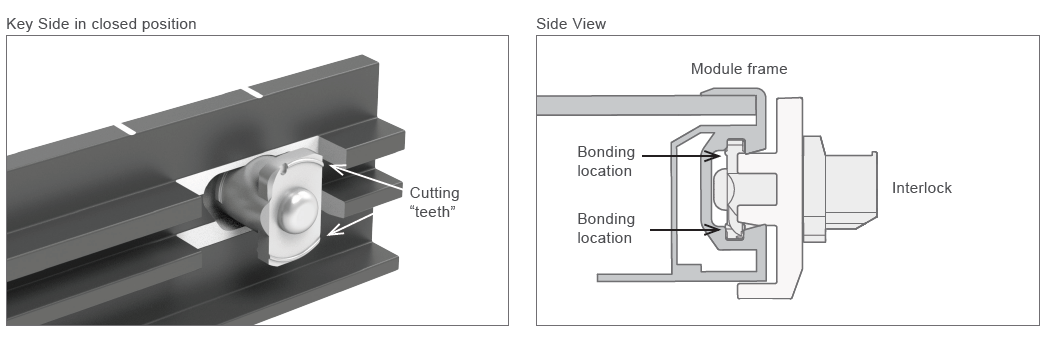 Forced interference during rotation of Interlock Zep causes teeth to cut through anodization on module frame, resulting in robust and UL certified bonding path.